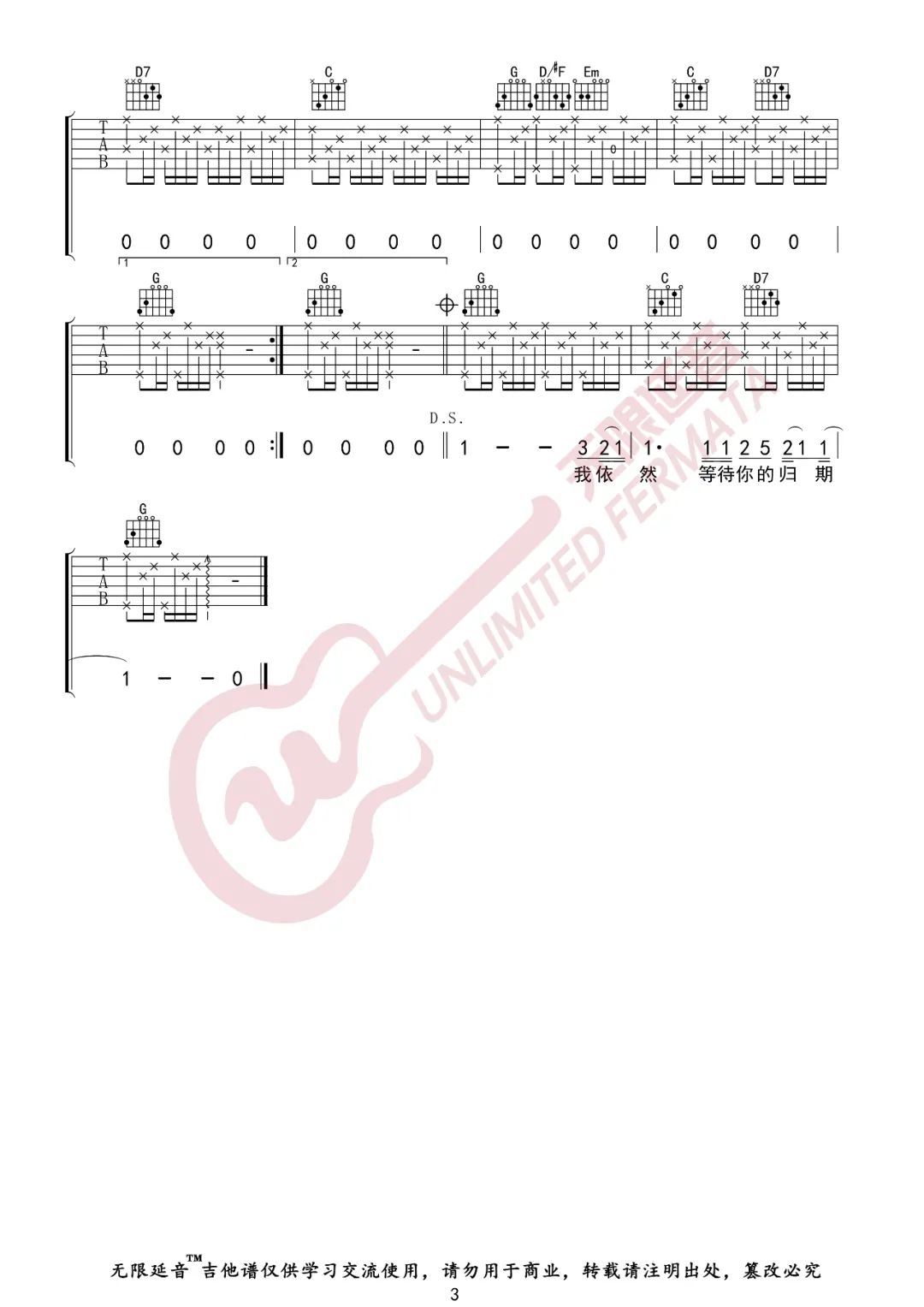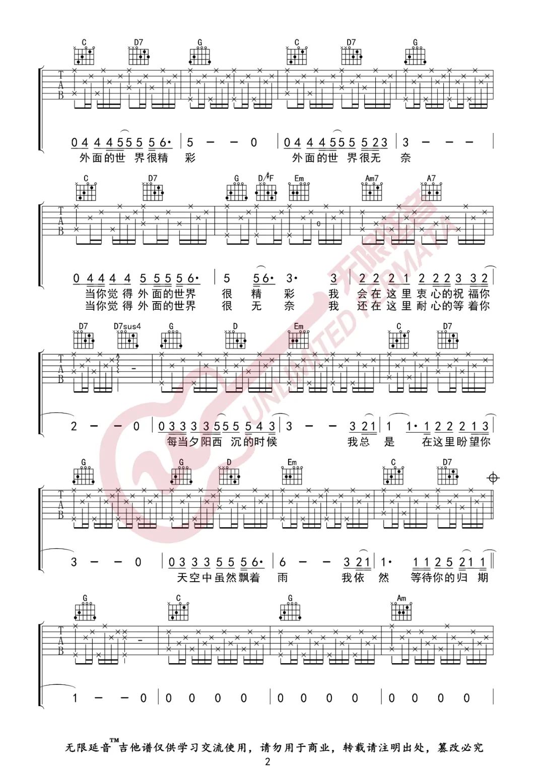 曲谱介绍: 曲谱说明:来自无限延音编配「外面的世界」吉他谱,本谱采用G调和弦指法编配,演奏可自由选择变调夹位置,适合自己的音域即可,难度一般。喜欢这首歌的朋友拿起吉他一起练起来吧,有任何问题请留言讨论。