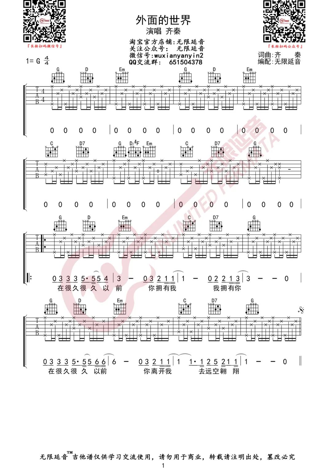 外面的世界吉他谱 - 齐秦 - G调吉他弹唱谱