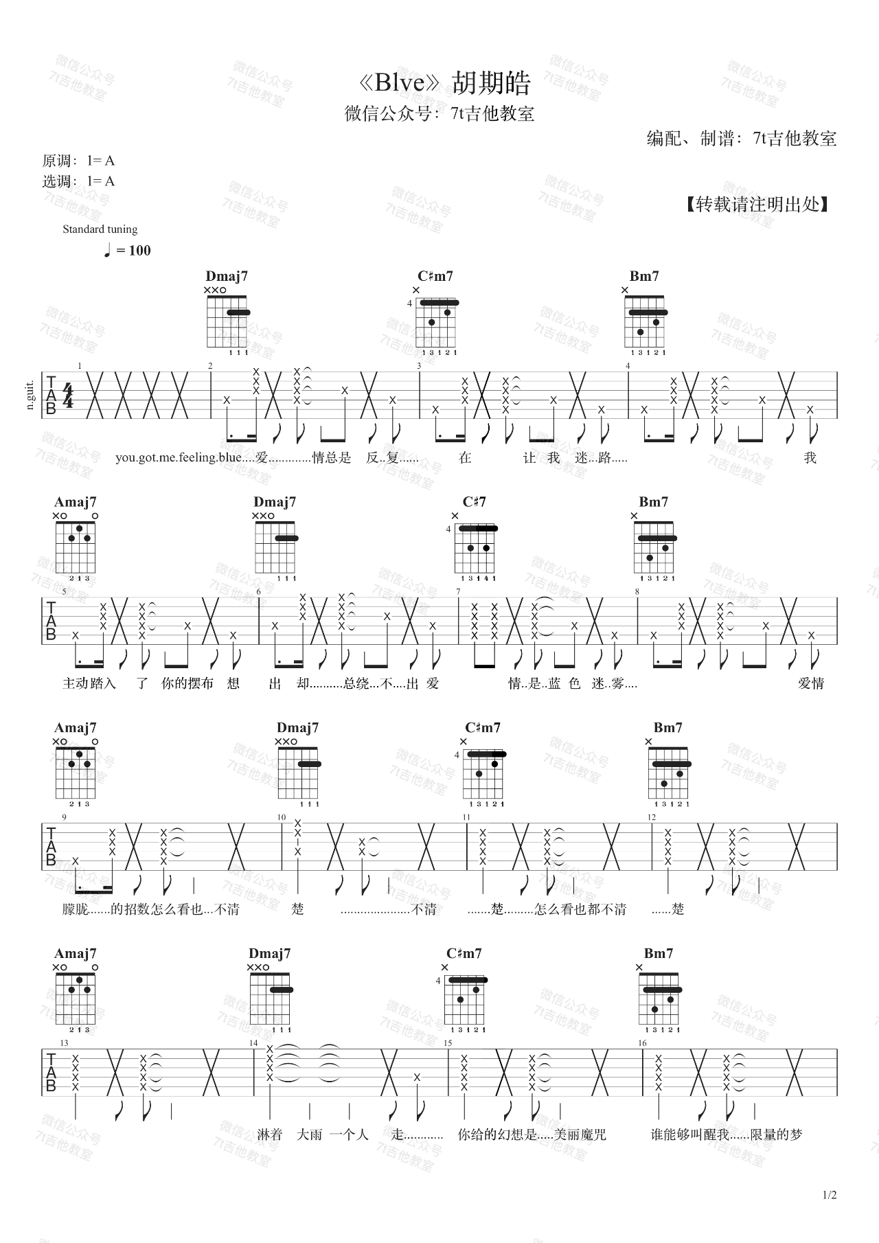 曲谱介绍: 曲谱说明:来自7t吉他教室编配「Blve」吉他谱,本谱采用A调和弦指法编配,演奏建议变调夹夹0-1品,也可以根据个人音域找到一个适合自己的位置,难度简单。视频里是标准音调弦,变调夹夹在第1品。想唱原调的话不夹变调夹就可以哦,男生可以不夹变调夹,如果觉得太高了也可以降半音调弦~喜欢这首歌的朋友拿起吉他一起练起来吧,有任何问题请留言讨论。本吉他谱配有视频 ➸ 点击播放