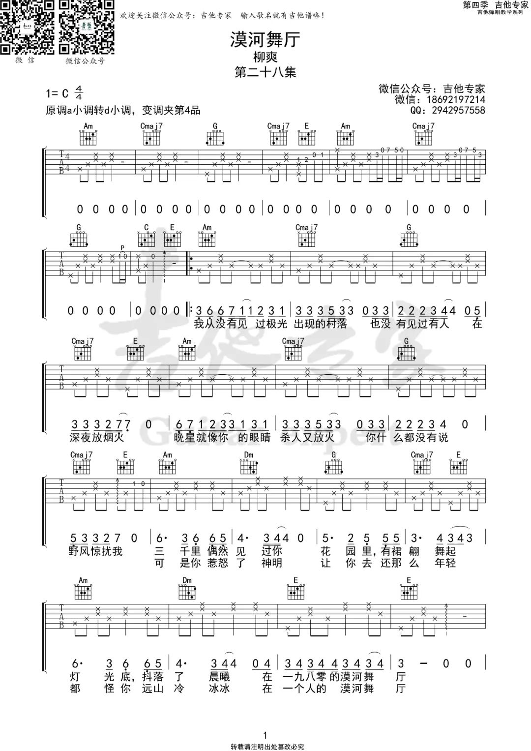 曲谱介绍: 曲谱说明:来自吉他专家编配「漠河舞厅」吉他谱,本谱采用C调和弦指法编配,演奏建议变调夹夹4品,也可以根据个人音域找到一个适合自己的位置,难度一般。这是感动全网的一首歌曲,以悲伤凄美的故事为创作来源,歌颂美好的爱情故事,也将这首歌献给所有因为不幸而逝去的生命。喜欢这首歌的朋友拿起吉他一起练起来吧,有任何问题请留言讨论。 本站共收录了4篇关于《漠河舞厅》的吉他谱,点此查看