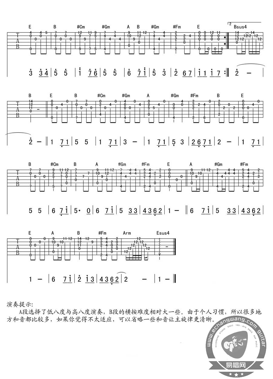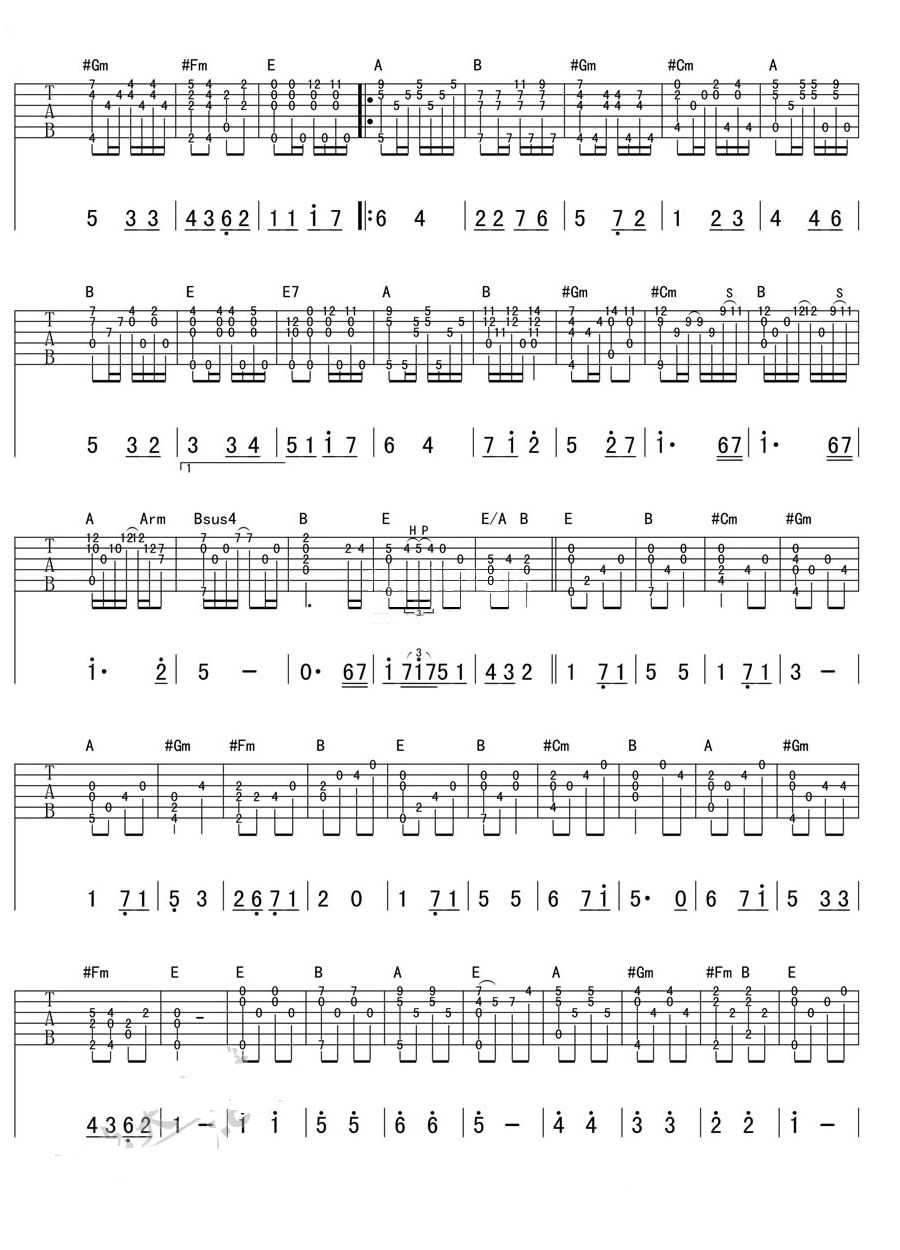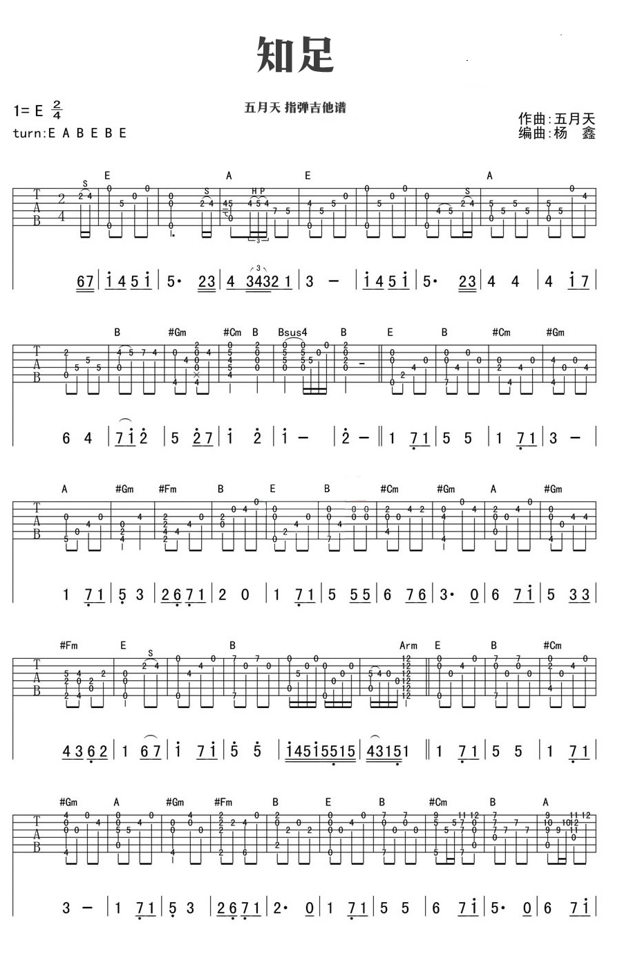 曲谱介绍: 五月天的一首歌曲,知足吉他谱指弹版,六线谱高清编配,共三张图片谱例。A段选择了低八度和高八度演奏,B段的横按难度相对大一点,由于个人习惯,有些地方和音使用比较多,如果琴友们不习惯,自己演奏时候可以进行省略,让主旋律更加清晰。 一首歌的旋律包容量真是无限大,似乎可以勾起所有关于过去当下的记忆与感受。往事历历。五月天的歌曲指弹谱推荐收藏。
