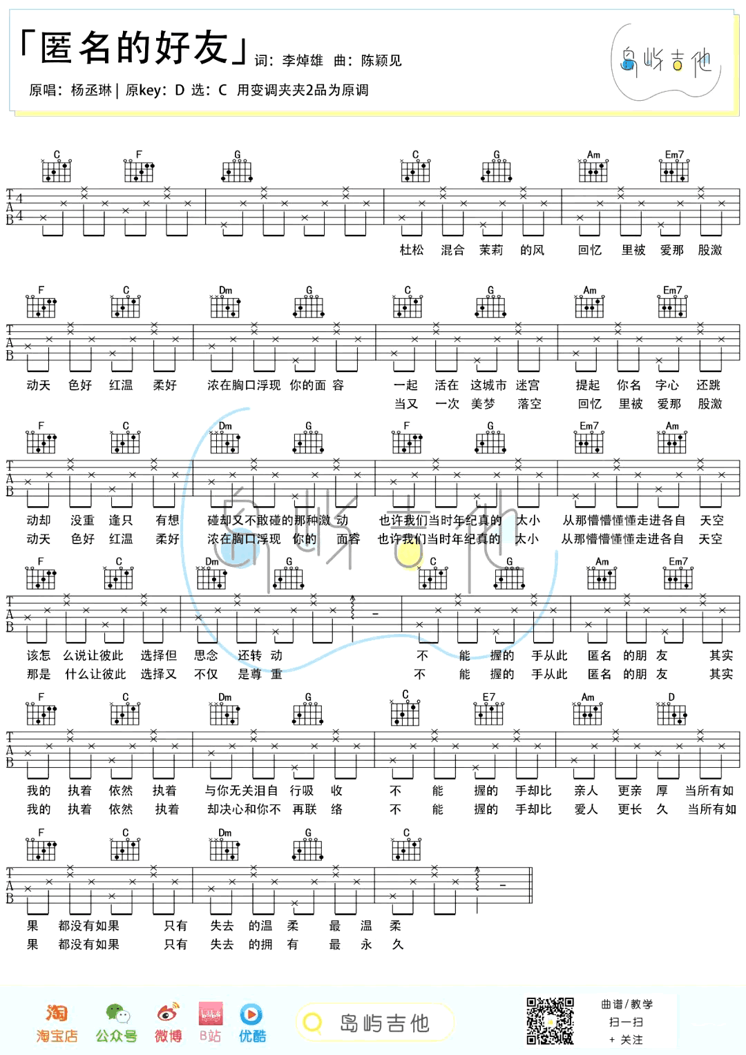 曲谱介绍: 匿名的朋友吉他谱,杨丞琳演唱,偶像剧《海派甜心》的插曲,韩剧《灿烂的遗产》中文片头曲。匿名的朋友吉他弹唱谱,和弦需要C调指法编配,变调夹夹二品为D调原调,感谢岛屿吉他制谱出品,琴谱网整理更新。