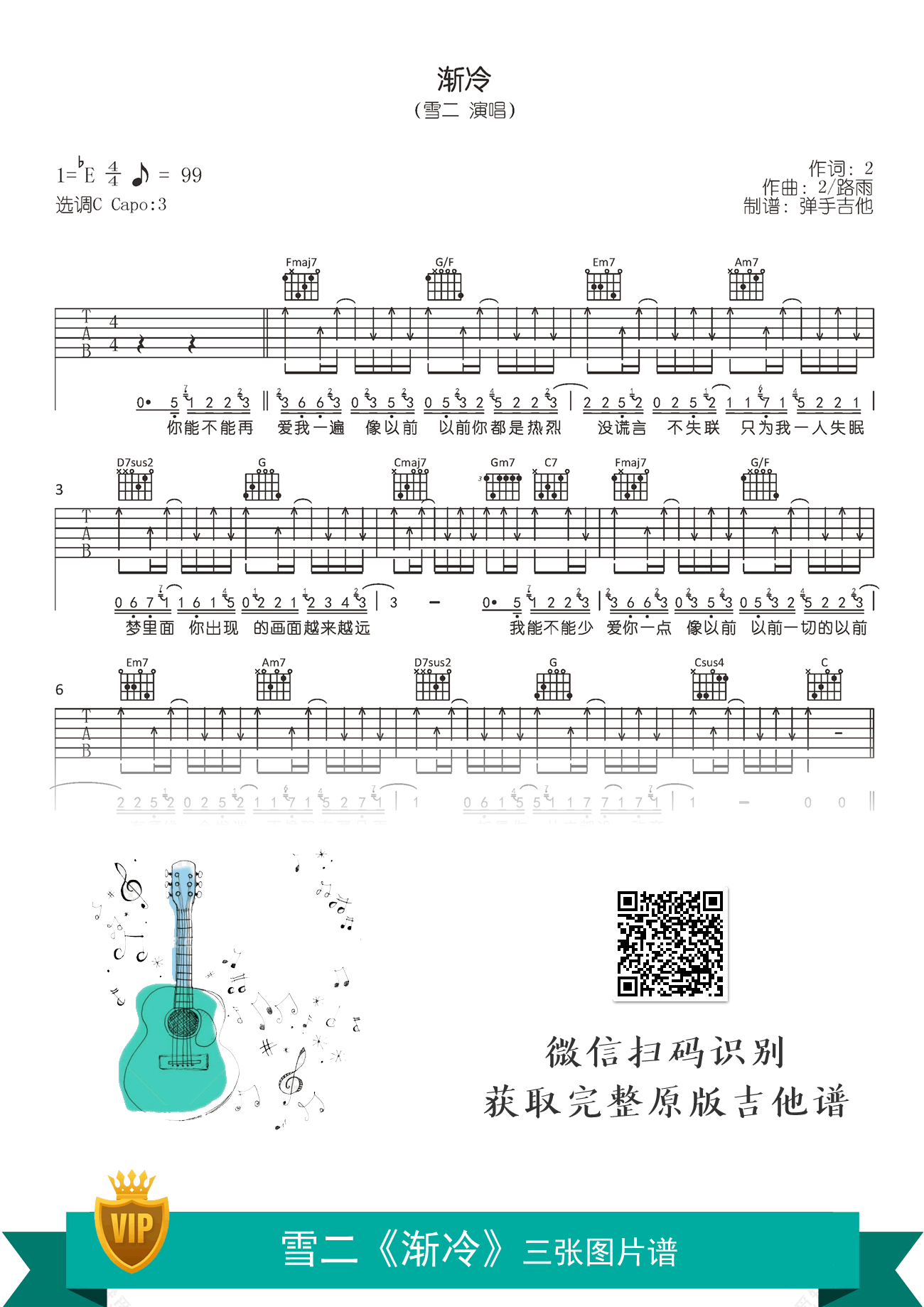 曲谱介绍: 《渐冷》吉他谱,雪二演唱的一首抖音热门新歌。渐冷六线谱,原调bE,选用C调指法,变调夹夹第三品位置。完整版共三张高清弹唱图片谱。琴谱网付费版更新上传。
