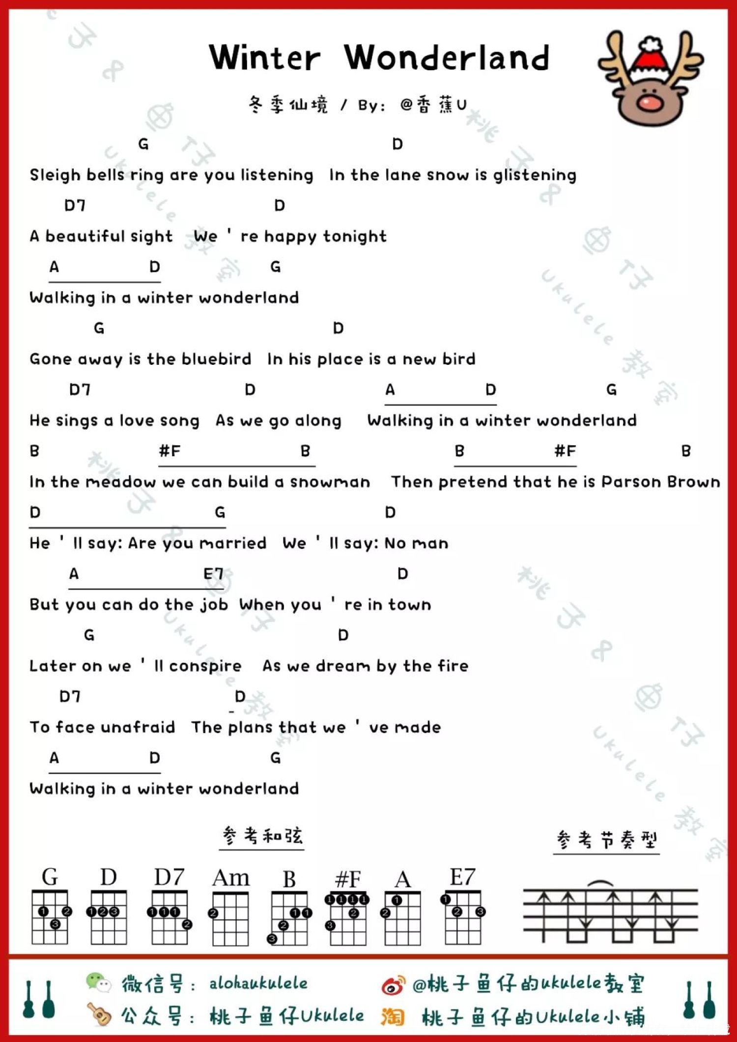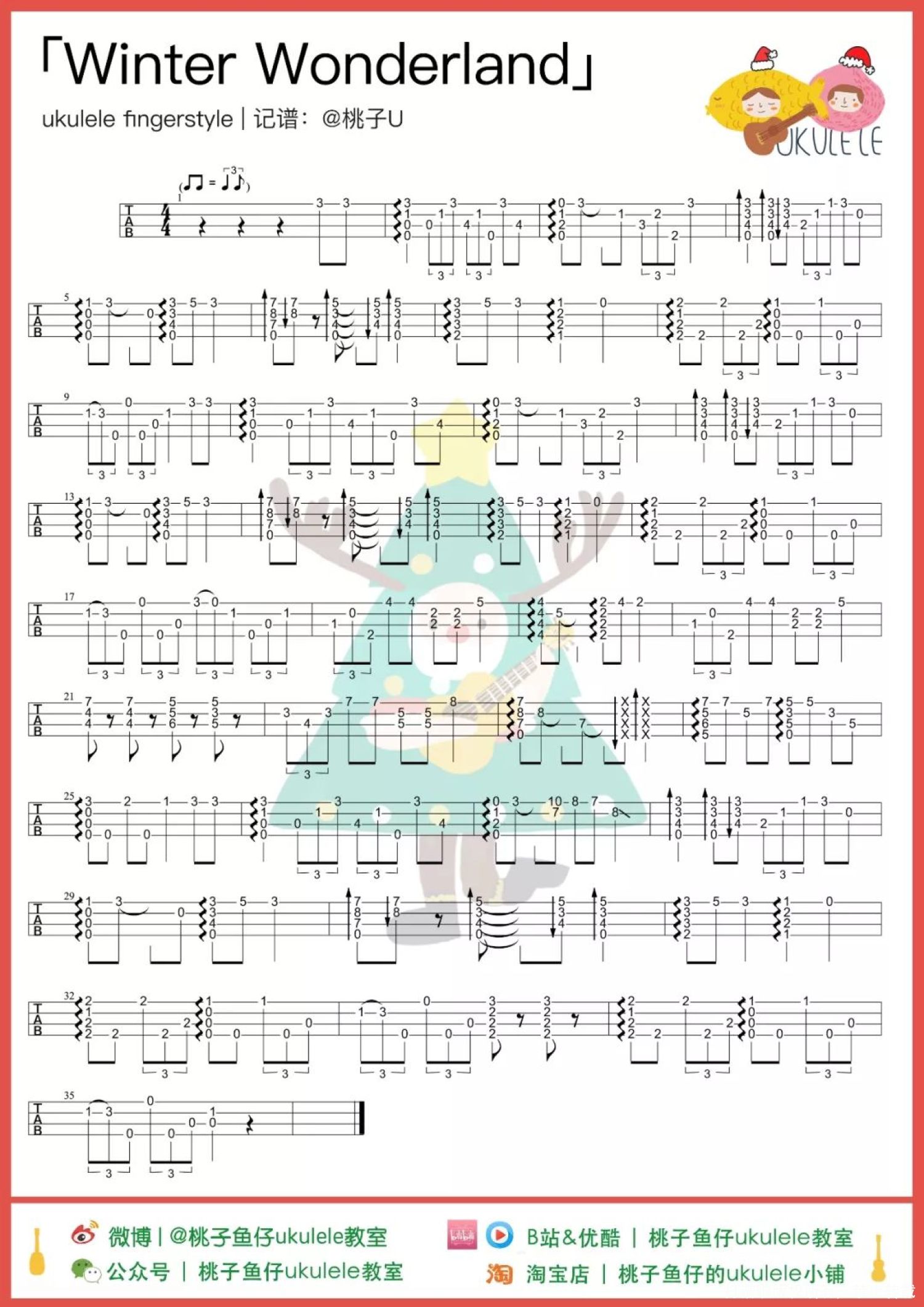 曲谱介绍: 桃子香蕉尤克里里指弹合奏 祝大家圣诞快乐   ● 「 Winter Wonderlandtown 」 ● 冬 日 仙 境 Winter Wonderland,“冬季仙境”是一个冬天的圣诞颂歌,被视为一个圣诞节流行标准,由伯纳德在1934年作曲,李察史密斯作词。至今已经被无数音乐人演绎过。据说灵感是伯纳德在看到洪斯代尔中央公园雪覆盖而写这首歌。史密斯在西方山疗养院治疗肺结核时写了歌词。   尤克里里指弹 ● cover by @桃子U & @香蕉U ● * 伴奏琴用了特殊调音(Barintone) 曲谱 Uku It * 指弹谱   * 弹唱谱   祝大家圣诞快乐~ 有音乐 或者 爱人都不孤单~ Merry Xmas Holidays!