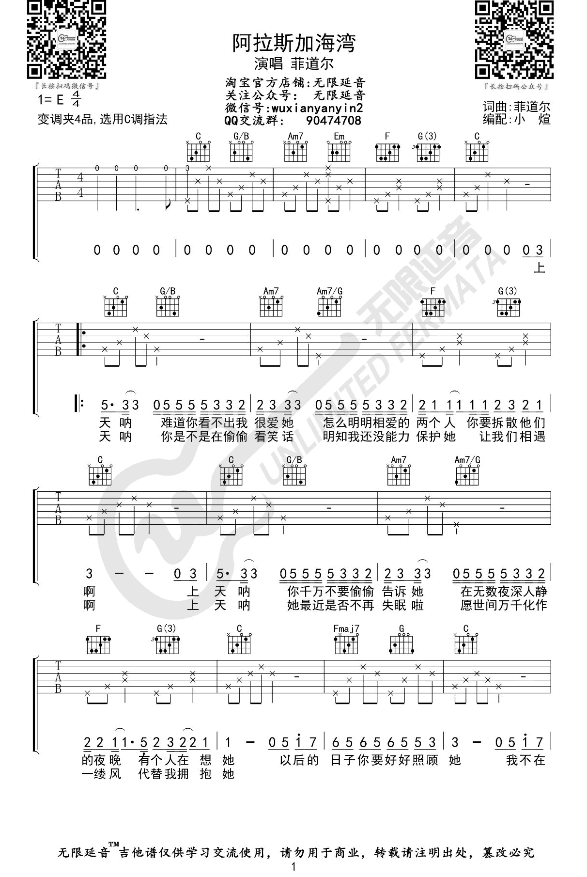 曲谱介绍: 《阿拉斯加海湾》吉他谱,菲道尔演唱,原调E选调C,变调夹夹第四品。阿拉斯加海湾吉他弹唱谱,琴谱网整理上传三张图片六线谱。无限延音编配出品。