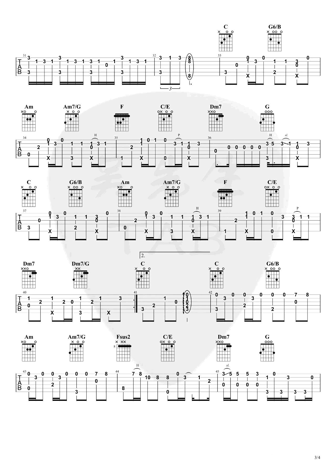曲谱介绍: 《间距》指弹吉他谱,EN的一首深情动听的歌曲改编,间距吉他指弹独奏谱,完整版共四张图片谱例,感谢吴先生tab制谱编配,琴谱网为琴友们整理更新上传。