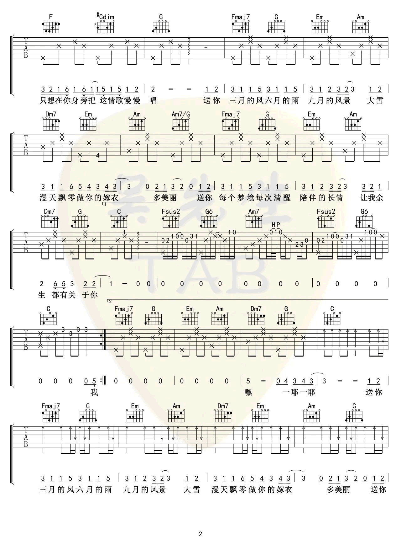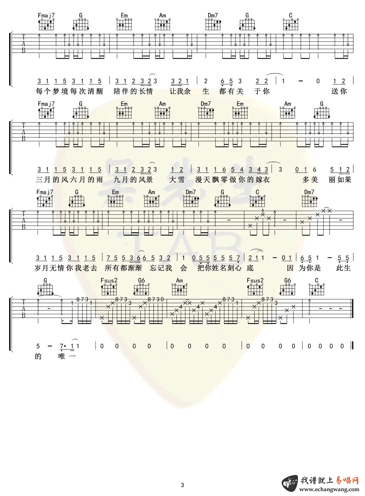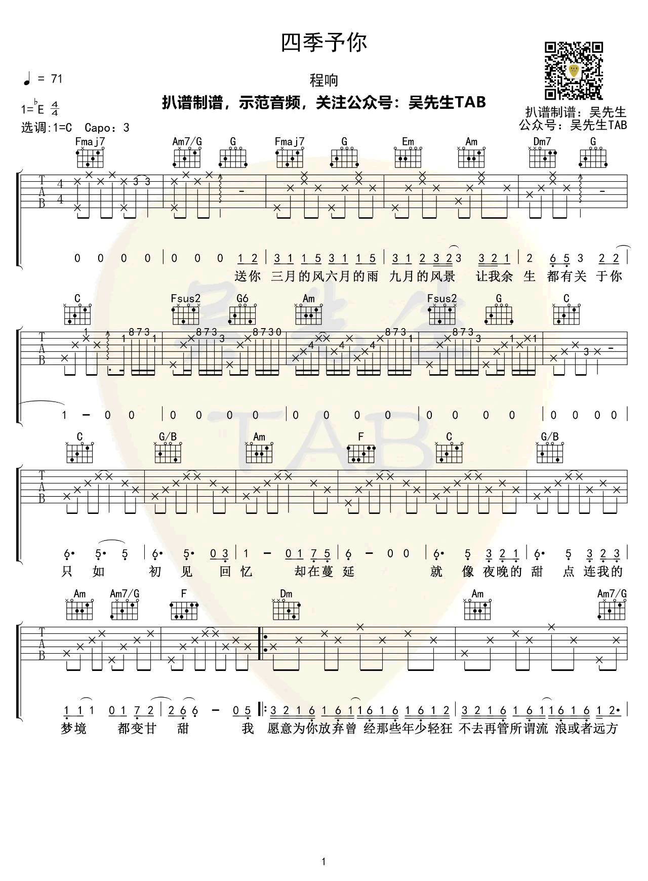 曲谱介绍: 《四季予你》吉他谱,程响演唱,四季予你六线谱,原调降E,选用C调指法编配,CAPO夹三品,三张弹唱图片谱。吴先生TAB制谱出品,琴谱网更新上传。