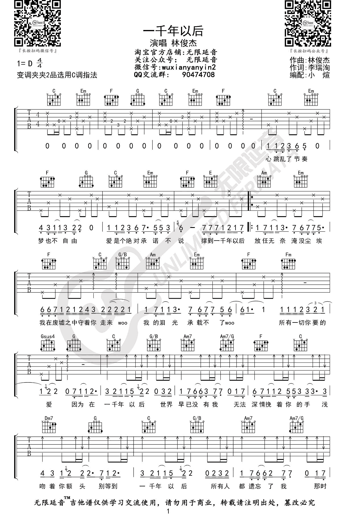 曲谱介绍: 一千年以后吉他谱,林俊杰的一首经典歌曲,原调D,选用C调指法编配,Capo夹二品。一千年以后吉他弹唱谱,两张图片谱,无限延音编配出品,琴谱网整理上传。