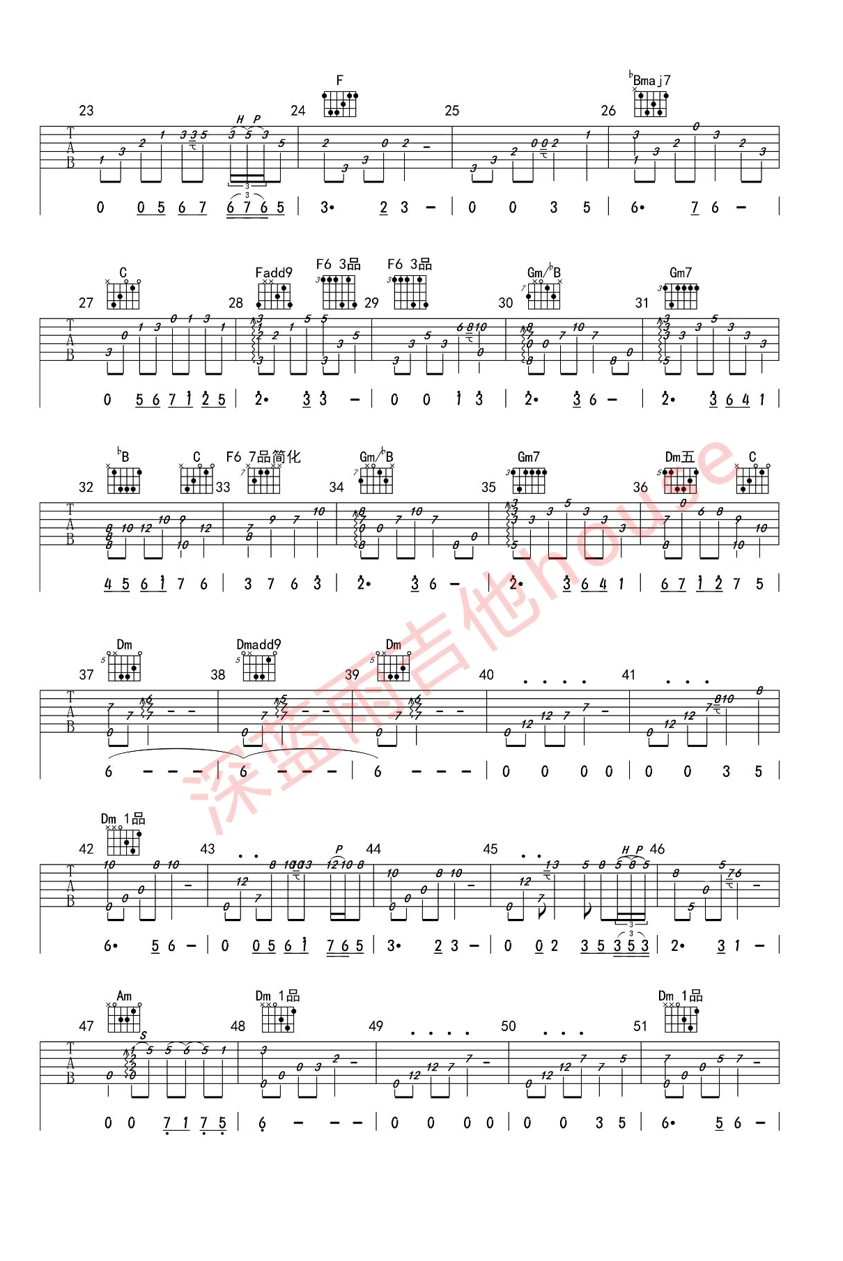 曲谱介绍: 琵琶语指弹吉他谱,林海的钢琴曲改编,电影《一个陌生女人的来信》插曲。琵琶语吉他独奏谱,F调,将第六弦调到D,其它琴弦不变,数字上方有小黑点的表示人工泛音Harm--。感谢古冰老师编曲,深蓝雨吉他出品,琴谱网整理更新。