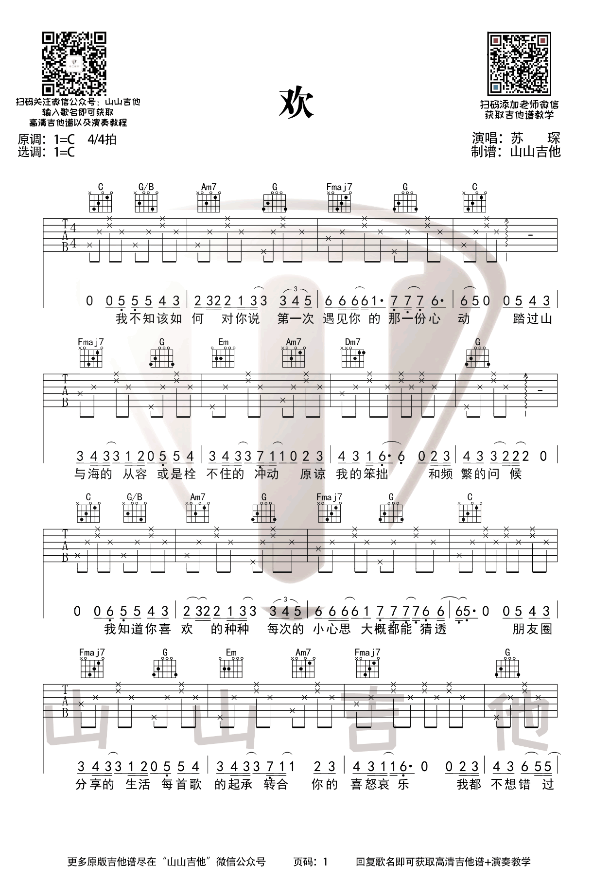 曲谱介绍: 《欢》吉他谱,苏琛词曲演唱的一首网络热门歌曲,欢吉他弹唱谱,C调编配,两张图片六线谱。随谱附上吉他弹唱视频,琴谱网感谢山山吉他出品分享。