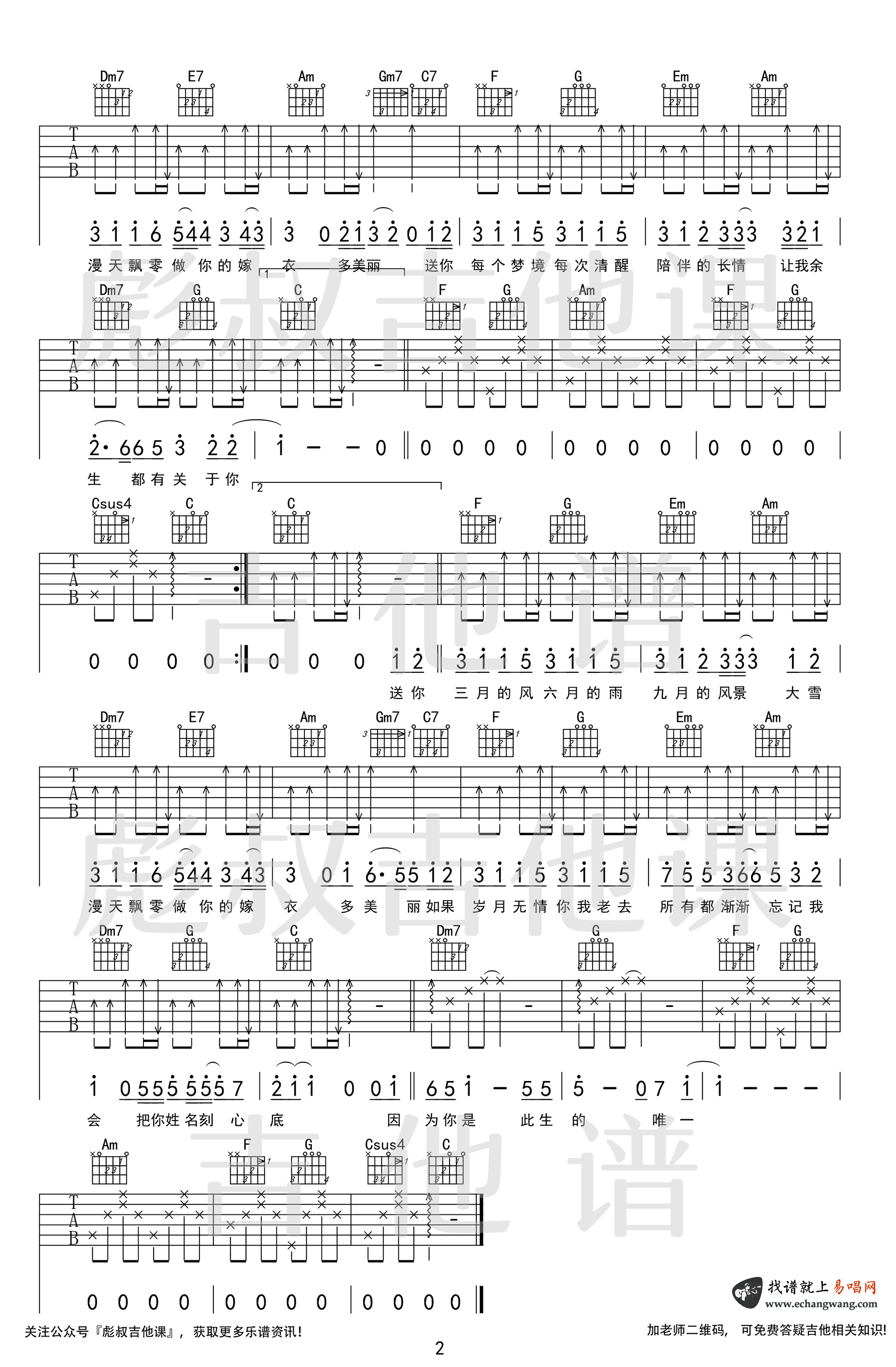 曲谱介绍: 四季予你吉他谱,程响演唱的一首温暖与清新的治愈歌曲,原调bE选调C,变调夹夹三品。四季予你吉他六线谱,简单版编配,两张弹唱图片谱。彪叔吉他课出品分享,琴谱网更新上传。