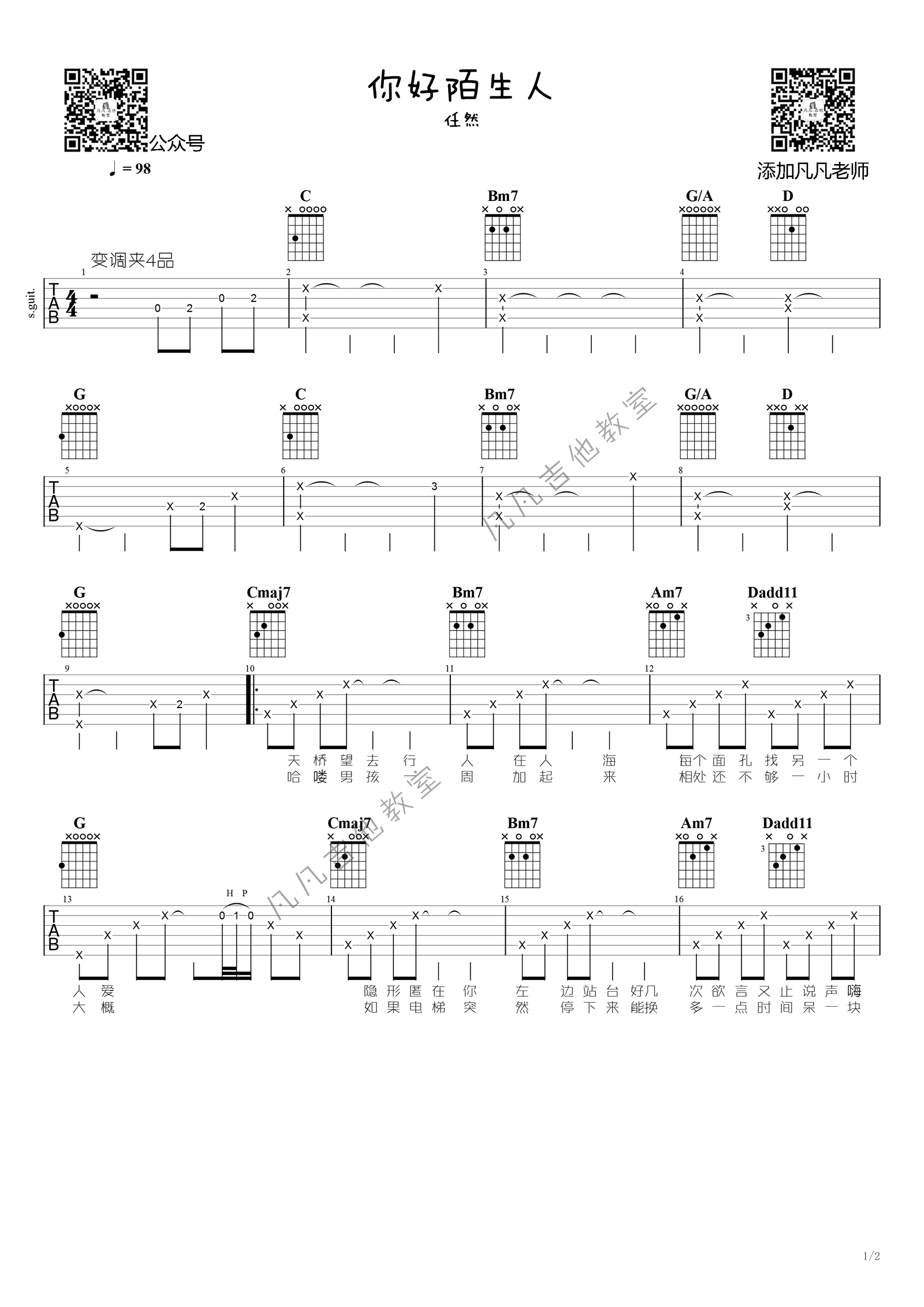 曲谱介绍: 你好陌生人吉他谱,任然演唱的一首治愈歌曲,你好陌生人六线谱,简单版编配,变调夹夹四品,两张图片谱。感谢凡凡吉他教室出品,随谱附上吉他弹唱演示视频,琴谱网上传。 整体相当简单,非常容易上手。前奏简单的同时也保留了原曲的调调。唱的部分更是5个和弦一直在重复。最难点应该在G和弦击勾弦,多练习食指击勾弦,大家看着歌词,注意反复。