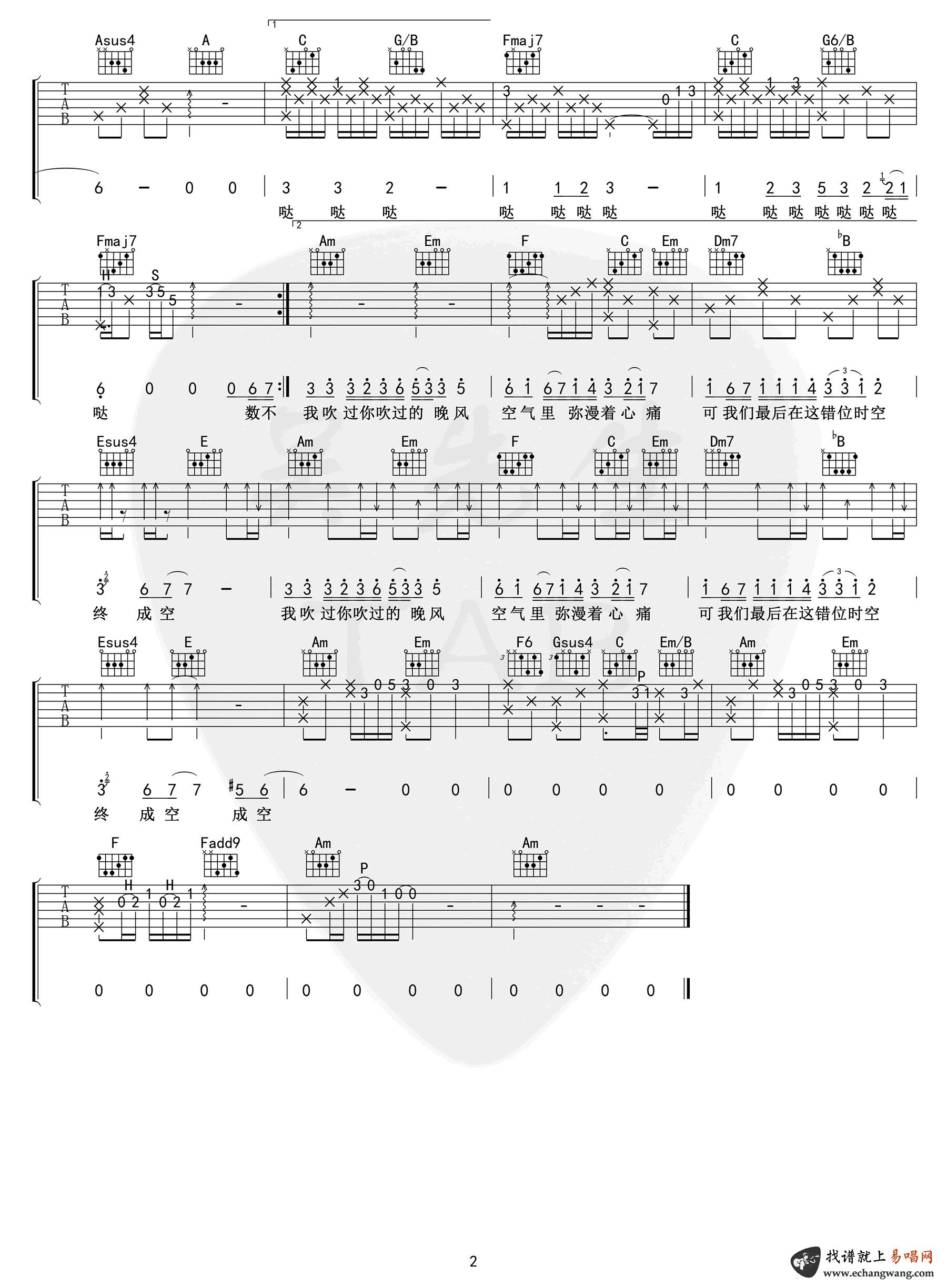 曲谱介绍: 错位时空吉他谱,艾辰的一首网络热门歌曲。《错位时空》吉他六线谱,原调降E,选用C调指法,CAPO夹三品。两张弹唱图片谱由吴先生tab编配,琴谱网上传更新。 生命中有一些人,与我们擦肩而过来不及相遇,遇见了却来不及相识,相识了来不及熟悉,最后还是要说再见。时间的钟摆滴滴答答不曾停下,空气里弥漫着你的气息,却终究抓不住你的手。我们像是存在于扰乱时差的错位时空,相遇相识却终成空。错位时空,各自安好。--【文案编辑 漓】