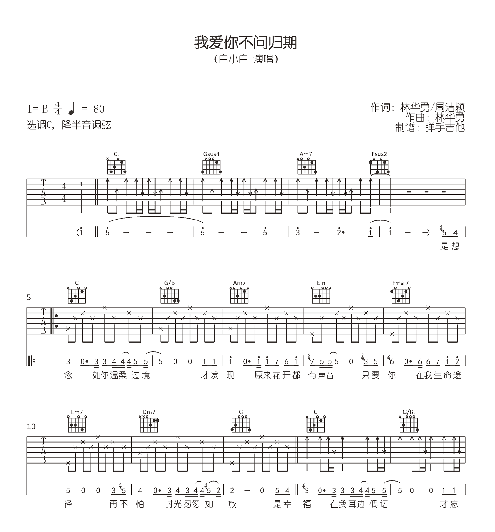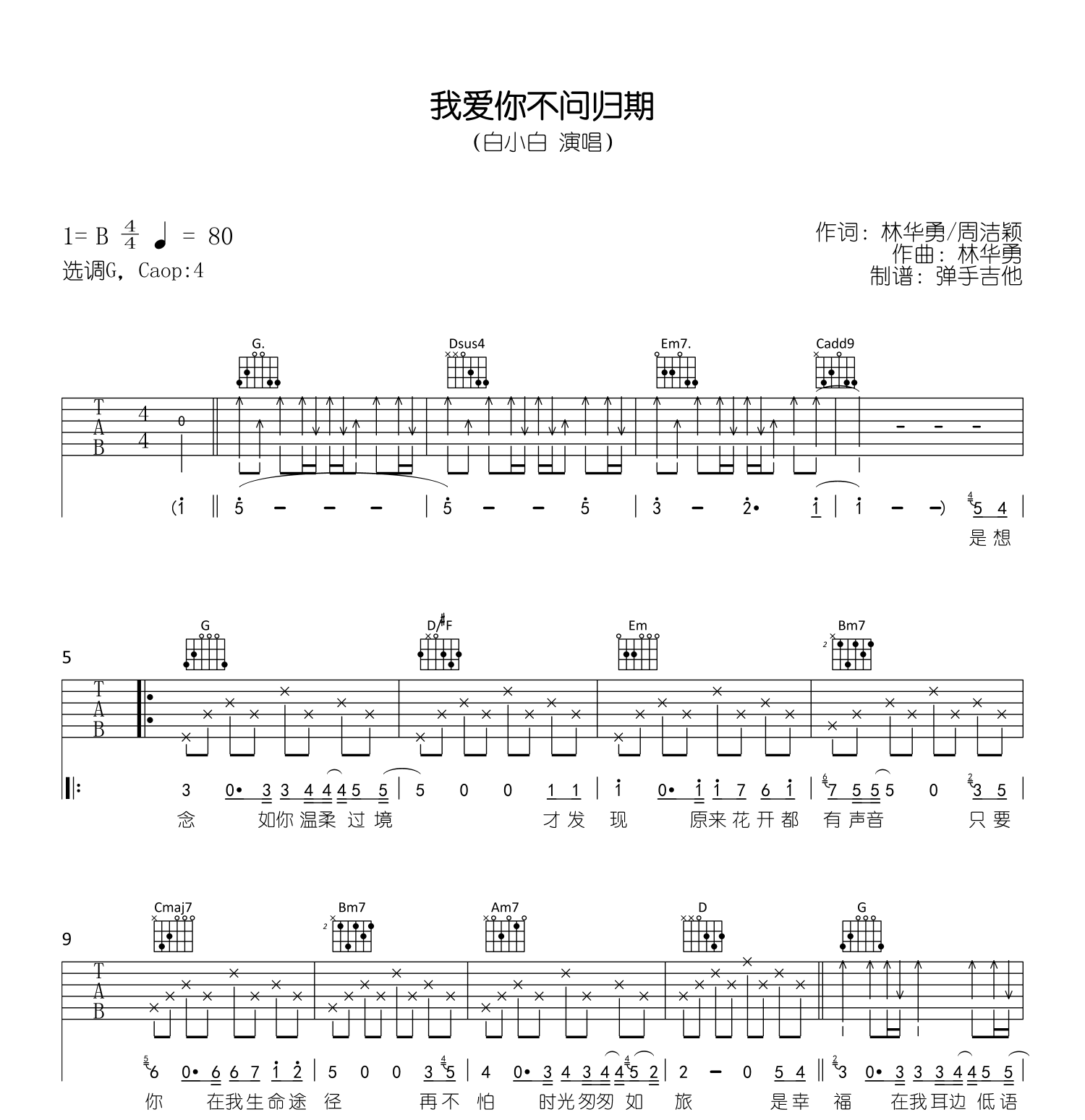 曲谱介绍: 白小白《我爱你不问归期》吉他谱,原版六线谱,为方便琴友们吉他弹唱,准备了两个调式编配,分别选用C调和G调指法,完整编配共六张高清图片谱。学习中有问题请加答疑微信。琴谱网整理上传。