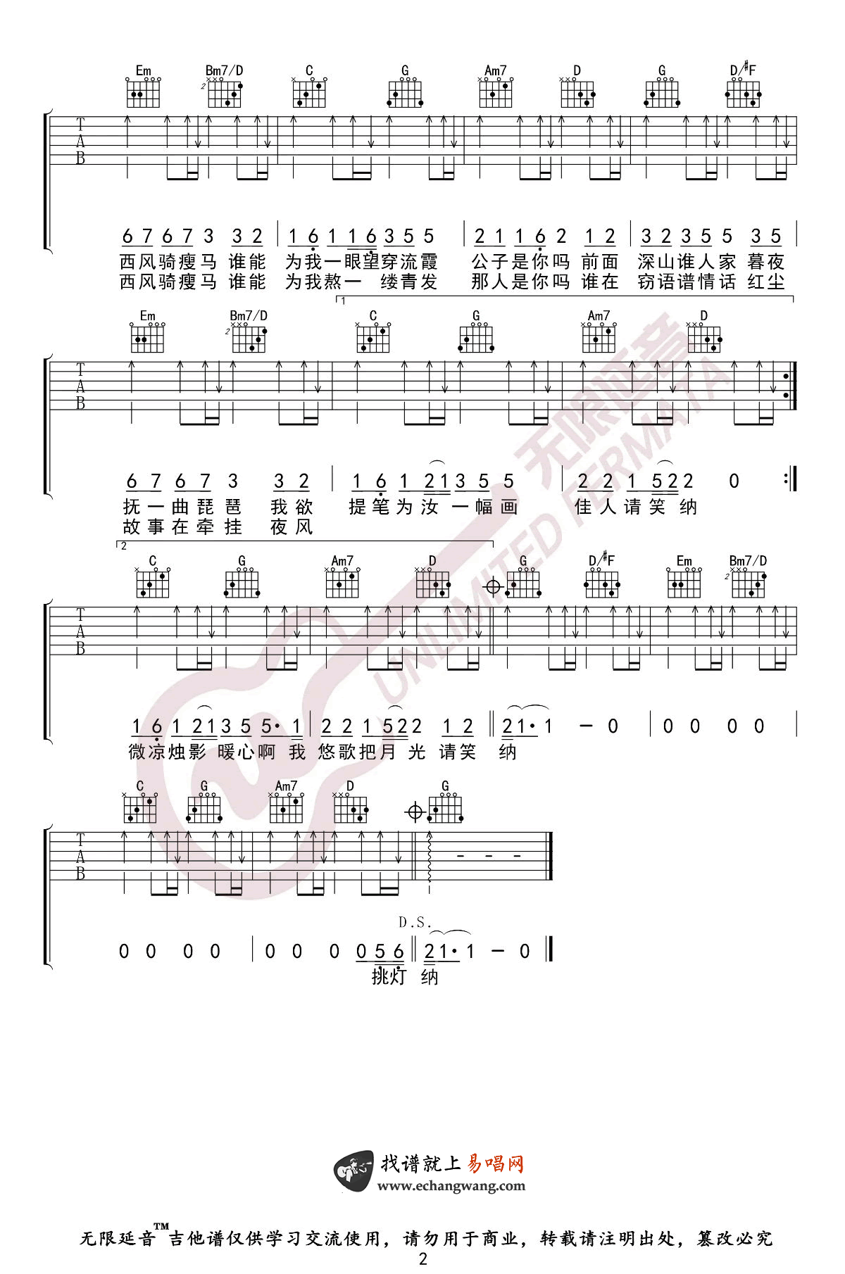 曲谱介绍: 笑纳吉他谱,花僮的一首热门古风歌曲。笑纳吉他弹唱谱,原调B,选用G调指法编配,变调夹第四品。两张图片六线谱由无限延音出品,琴谱网吉他谱上传分享。