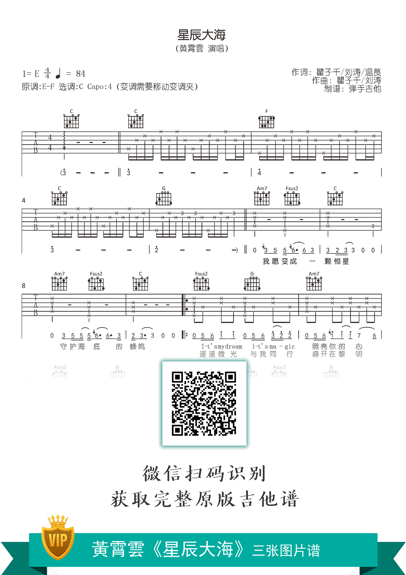 曲谱介绍: 星辰大海吉他谱,黄霄云演唱,一首迅速上榜的热门歌曲。星辰大海吉他弹唱谱,原调E-F,选调C,CAPO夹四品,变调需要移动变调夹。完整版共三张高清图片六线谱。琴谱网上传更新。