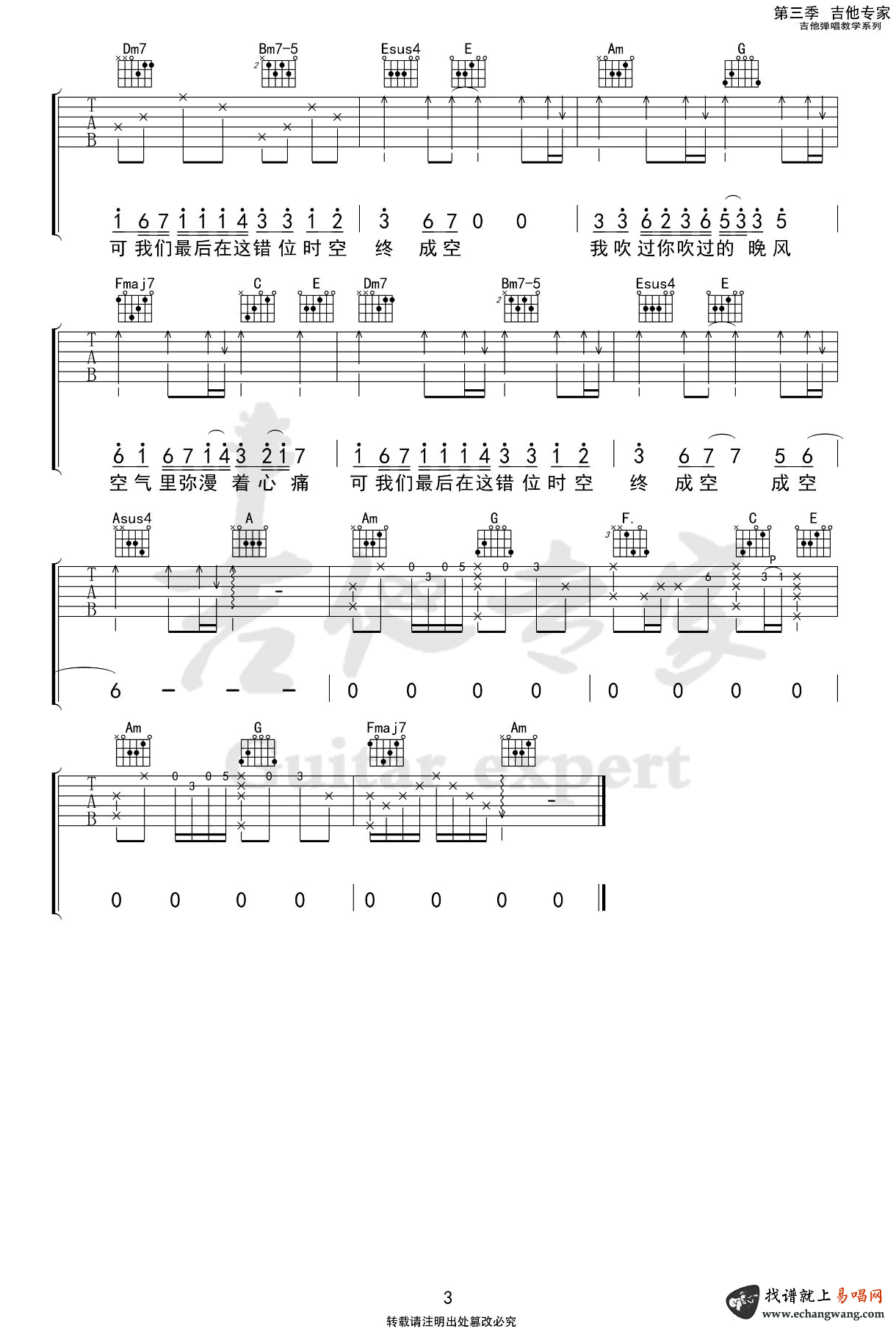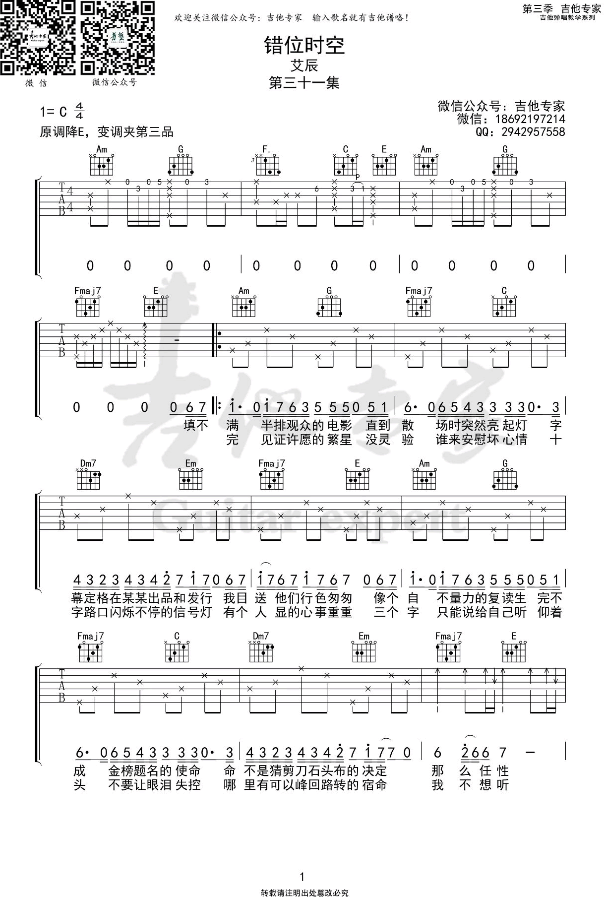 曲谱介绍: 错位时空吉他谱,艾辰演唱,一首旋律洗脑的网络热门歌曲,错位时空吉他六线谱,原调降E,选用C调指法,Capo夹三品。三张弹唱图片谱例。六线谱由琴谱网上传,吉他专家制谱出品。