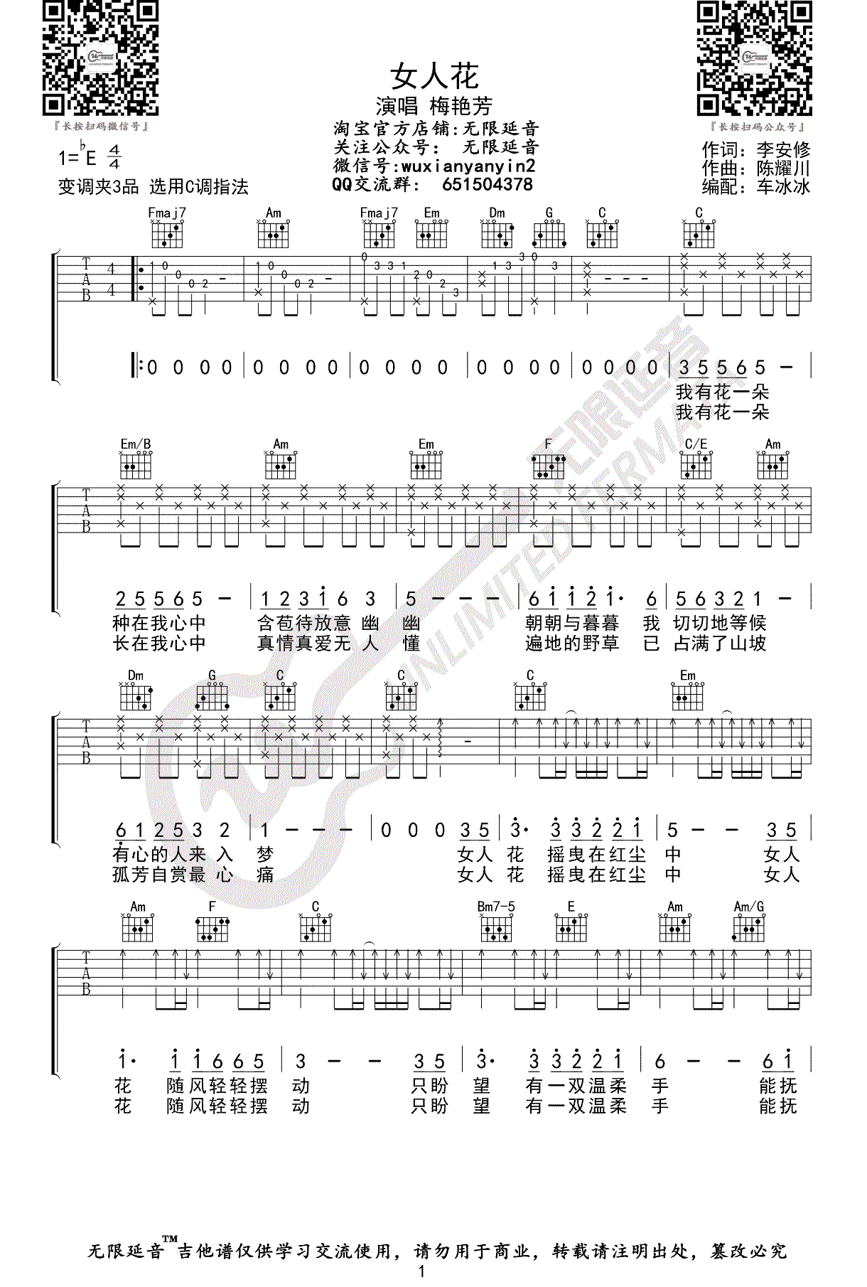 曲谱介绍: 女人花吉他谱,梅艳芳经典代表作品,女人花吉他弹唱谱,原调降E选用C调指法,变调夹夹三品,共三张图片六线谱。无限延音编配出品,琴谱网上传分享。