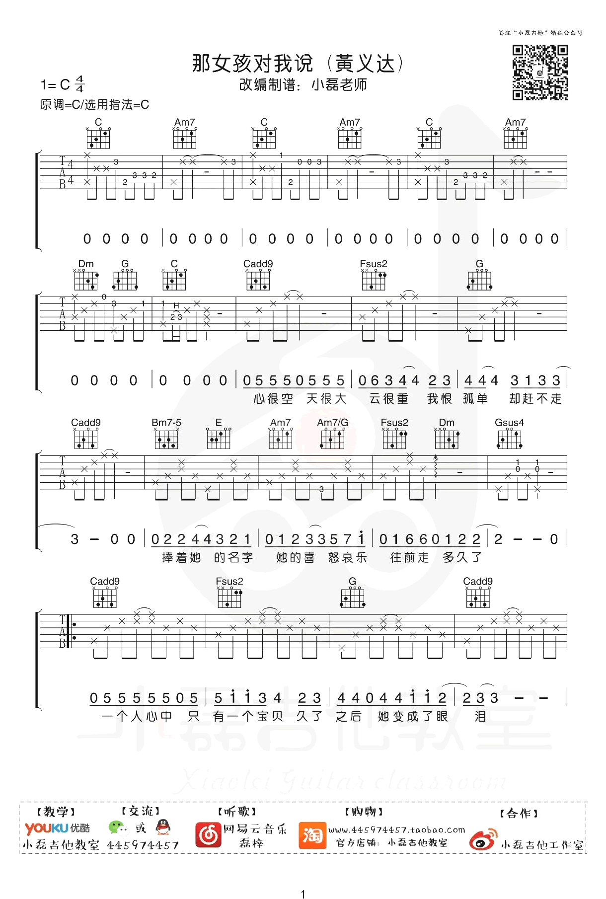 曲谱介绍: 那女孩对我说吉他谱,黄义达的一首代表歌曲,因抖音翻唱而又火了起来。那女孩对我说六线谱,C调编配,完整版共四张弹唱图片谱。感谢小磊吉他编配出品,琴谱网上传推荐。 编配说明:原版中其实大量的乐队编排,算是一首摇滚曲风的设计,特别是层次比较明显,前段非常弱,后段有非常强烈,A/B段区分的也尤为明显,是一首比较容易演奏的歌曲。我们制作的乐谱也都是非常考虑到层次的,也是希望可以通过简单的演奏,区分段落,让歌曲更有反差效果。