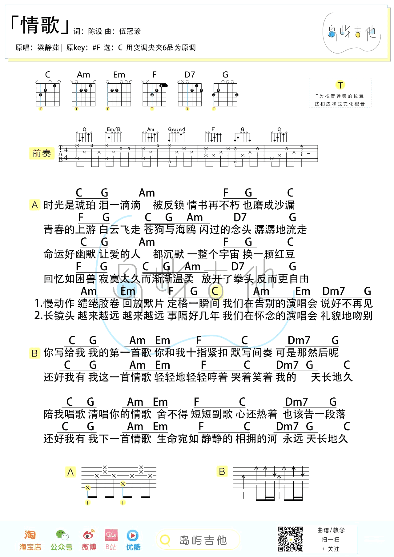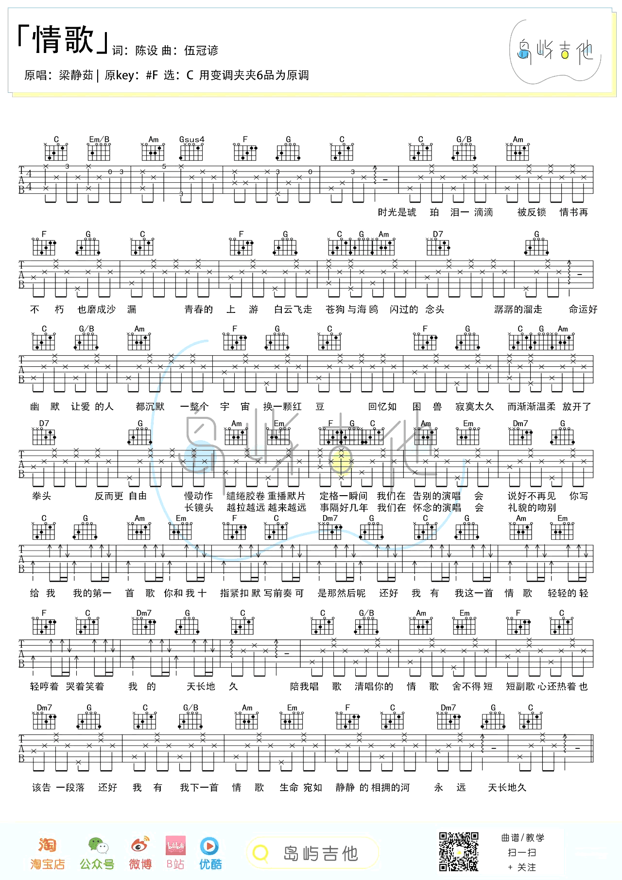 曲谱介绍: 情歌吉他谱,梁静茹经典代表歌曲,情歌吉他六线谱,原调升F选调C,变调夹夹六品。和弦图片六线谱,岛屿吉他制谱编配,琴谱网更新上传。
