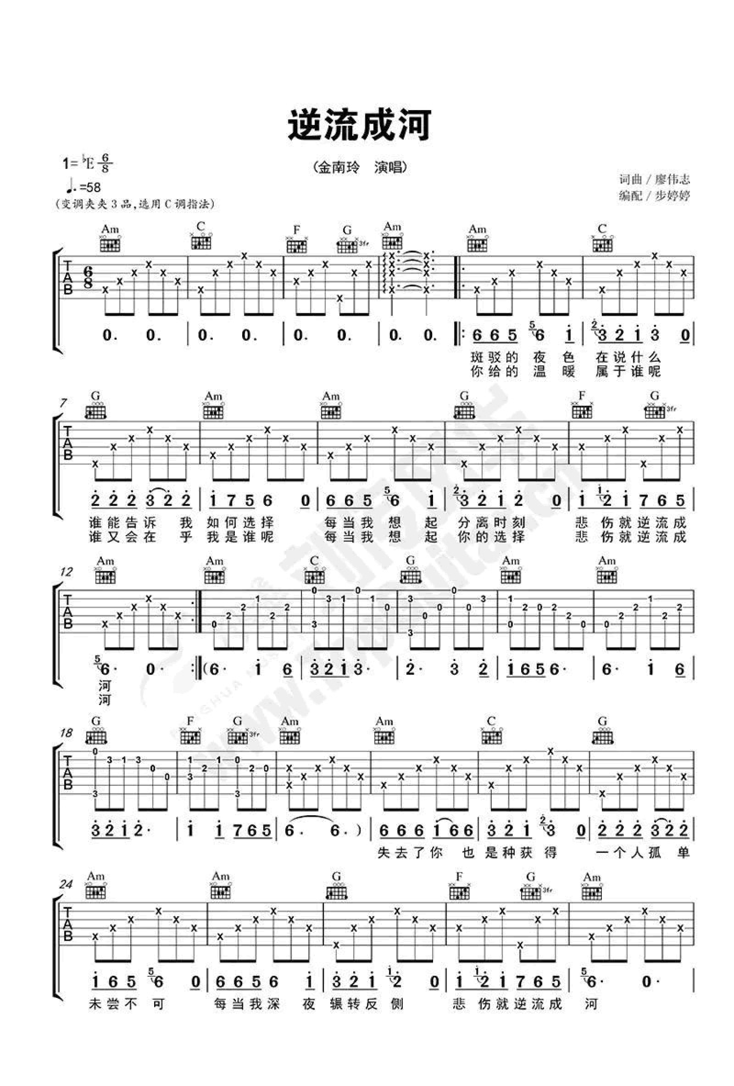 曲谱介绍: 金南玲《逆流成河》吉他谱,原调降E,变调夹夹3品,选用C调指法,曲谱收录于《吉他爱好者》中,寂静的时候,听着歌,感受着忧伤的旋律,忧伤点点堆积,逆流成河。仿佛看到另一个灵魂心碎的悲伤,但更多的是倔强和不屈。梦境是美好的,强悍的却永远是命运,但我们总是倔强而不屈的在命运之中点缀上属于自己的美好,创造着属于自己的天堂。