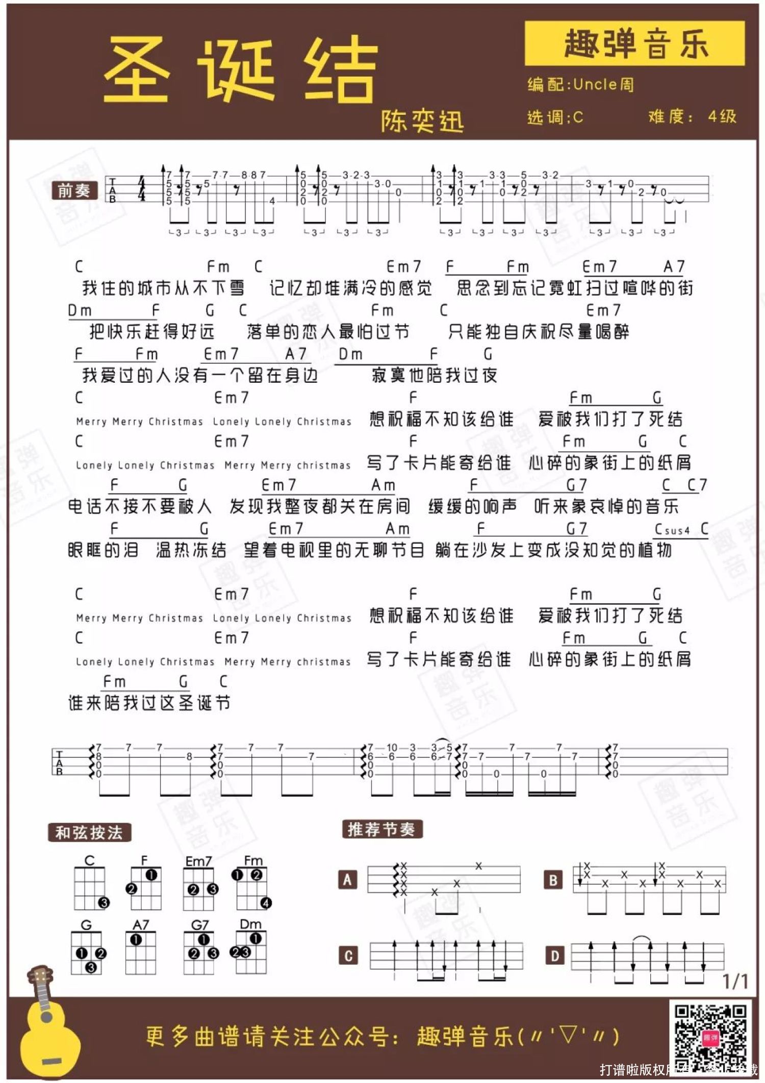 曲谱介绍: 平安夜就要到了,明明是个正经的“外国版春节”,大街上却散发着狗粮的味道…… 36D的胸一阵隐隐作痛,难道单身狗就没有过圣诞节的权利了吗? 其实你并没有落单,只是没找到解开心结的正确方式~今天,杨可爱就来教大家一首圣诞流行情歌表达你的心声♪   《圣诞结》唱的是一个寂寞孤单的圣诞节,曾经陪自己过节的恋人已形同陌路,却总在每年这个时候回想起在一起的日子。 实际上,时光只是为你淘掉了那些不适合陪你走到最后的人生过客。能陪你度过漫长岁月的人,一定会在不远的将来到来。 圣诞终究是一个温暖的节日。落单?不存在的,因为有我们和Ukulele一直陪着你。   弹唱教学   弹唱曲谱