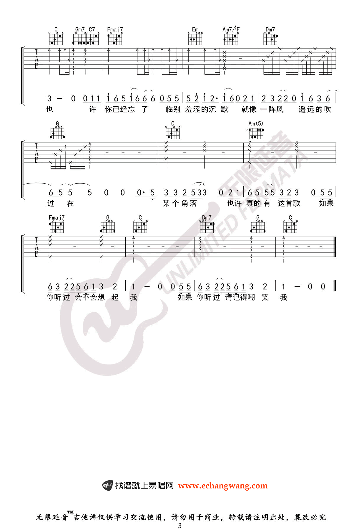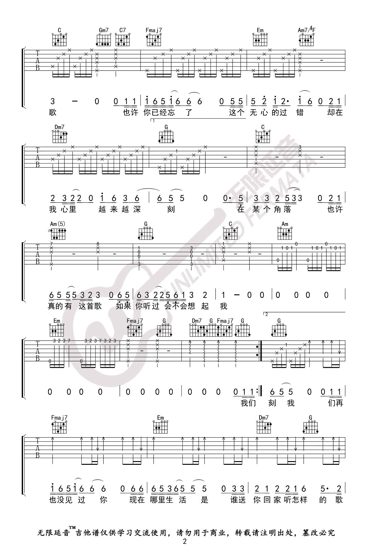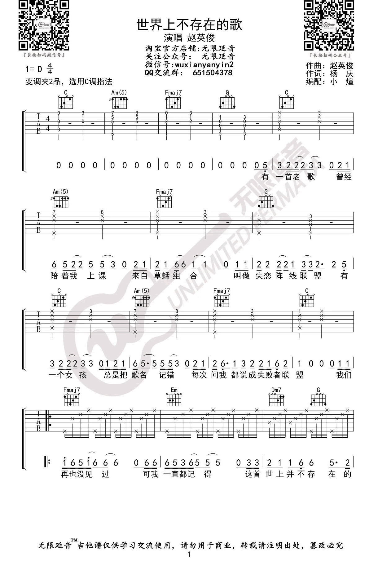 曲谱介绍: 世界上不存在的歌吉他谱,赵英俊创作的一首暖心歌曲,世界上不存在的歌六线谱,原调D,选用C调指法,变调夹夹第二品,三张弹唱图片谱。无限延音出品,琴谱网更新上传。