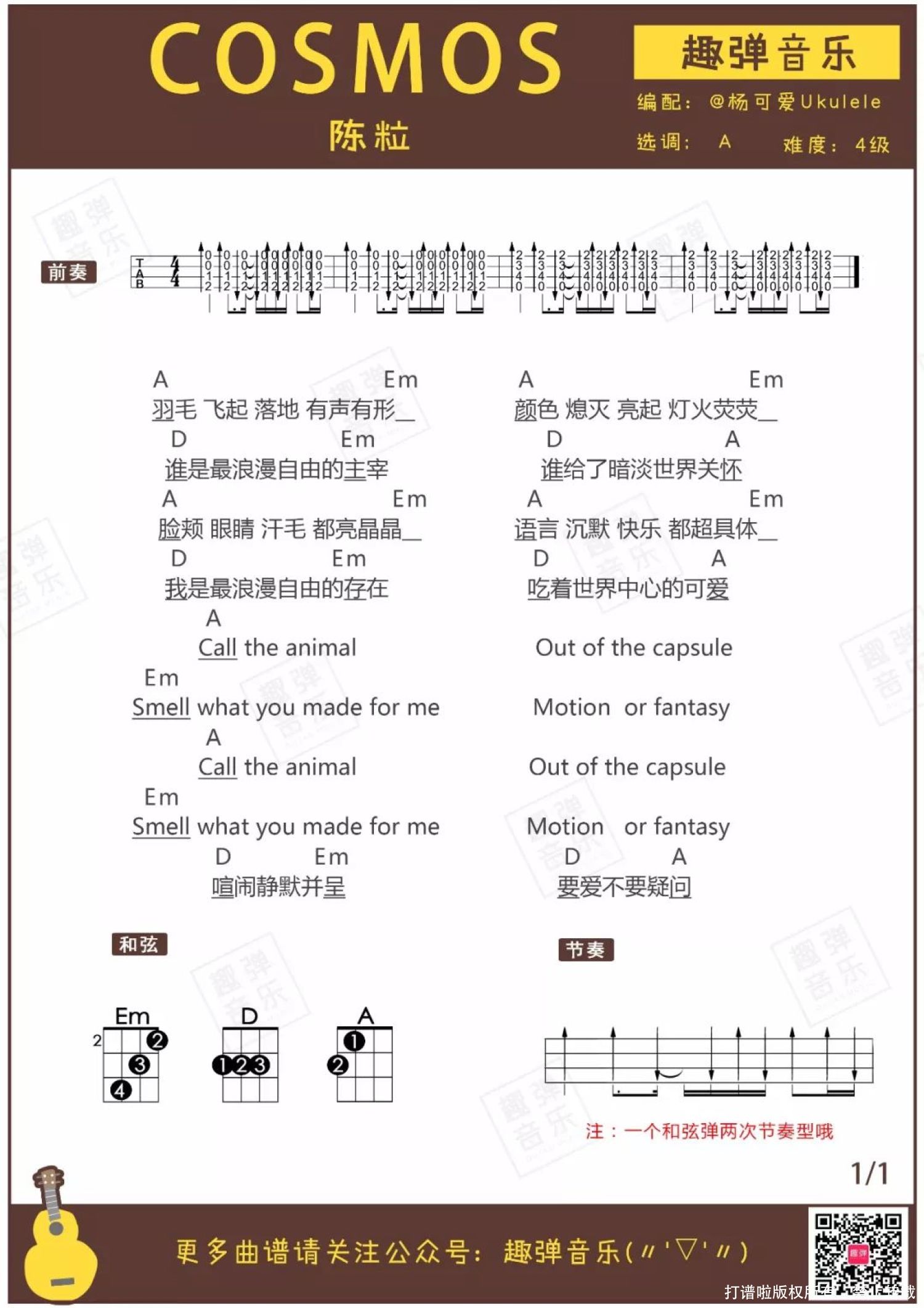 曲谱介绍: 是的,我们没有搞错性别,把男女歌迷都迷得神魂颠倒叫老公的,就是女歌手陈粒。 大多数人的印象里,陈粒个性、叛逆,是一个头发五颜六色、纹着花臂的酷酷女孩。 每次发新歌都会带来奇妙的感官体验的陈粒,这次竟然写了一首歌,明目张胆地夸自己可爱。 新歌《COSMOS》,有着干净利落的节奏、撩人迷幻的旋律,乍一听还是挺陈粒style的,但这歌词怎么看怎么调皮。   我是最浪漫自由的存在 吃着世界中心的可爱   不再是《奇妙能力歌》的民谣小情绪,不再是《易燃易爆炸》的叛逆乖张,这次陈粒直接用这首新歌告诉所有人:爱自己的女孩就是这么自信而闪亮。   这首新歌是为COSMO时尚美丽盛典打造的主题曲。从词曲到制作都由陈粒亲自操刀。   COSMOS,意为宇宙。歌词不难看出陈粒想要表达的现代独立女性的生活态度:要美丽要自信,也要爱和梦想。   羽毛 飞起 落地 有声有形 颜色 熄灭 亮起 灯火荧荧 脸颊 眼睛 汗毛 都亮晶晶   这次的陈粒要带着我们一起放飞自我:我最自由,我最可爱,我连汗毛都在发光。她的歌她的性格都在告诉我们:自信的女孩子最美丽。   当有人把陈粒划为民谣歌手时,被她笑着怼了回去:“你才民谣歌手呢!” 早期的陈粒确实常唱文艺气息满满的民谣,但擅长打破常理和规则的她又怎么肯一直守在他人为她划的圈子里。 听了《奇妙能力歌》你以为她小清新,她却用《易燃易爆炸》上演一出离经叛道;当你觉得她有个性酷得不行,她却又开始古灵精怪,高冷不再。 她就像烟一样捉摸不定,没有形状,无法定义。她可爱有趣,亦静亦动,不随波逐流,只坚持自己喜欢的音乐,这就是陈粒。 跟着老公粒粒一起摇头晃脑来一首《COSMOS》,做全世界最可爱的女孩!   COSMOS尤克里里谱