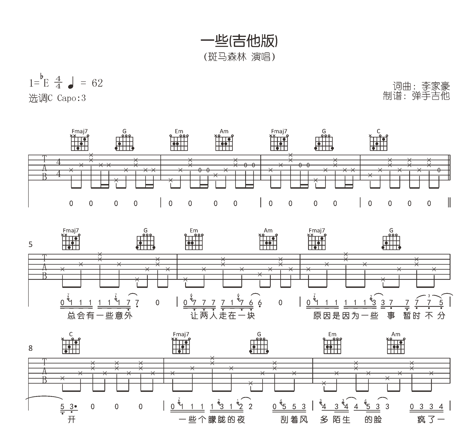 曲谱介绍: 一些吉他谱,斑马森林在《中国好声音》取得亚军成绩后发布的第一支单曲。一些吉他弹唱谱,原调降E,选用C调指法编配,变调夹夹三品。完整版六线谱共三张高清图片谱例,琴谱网整理更新。