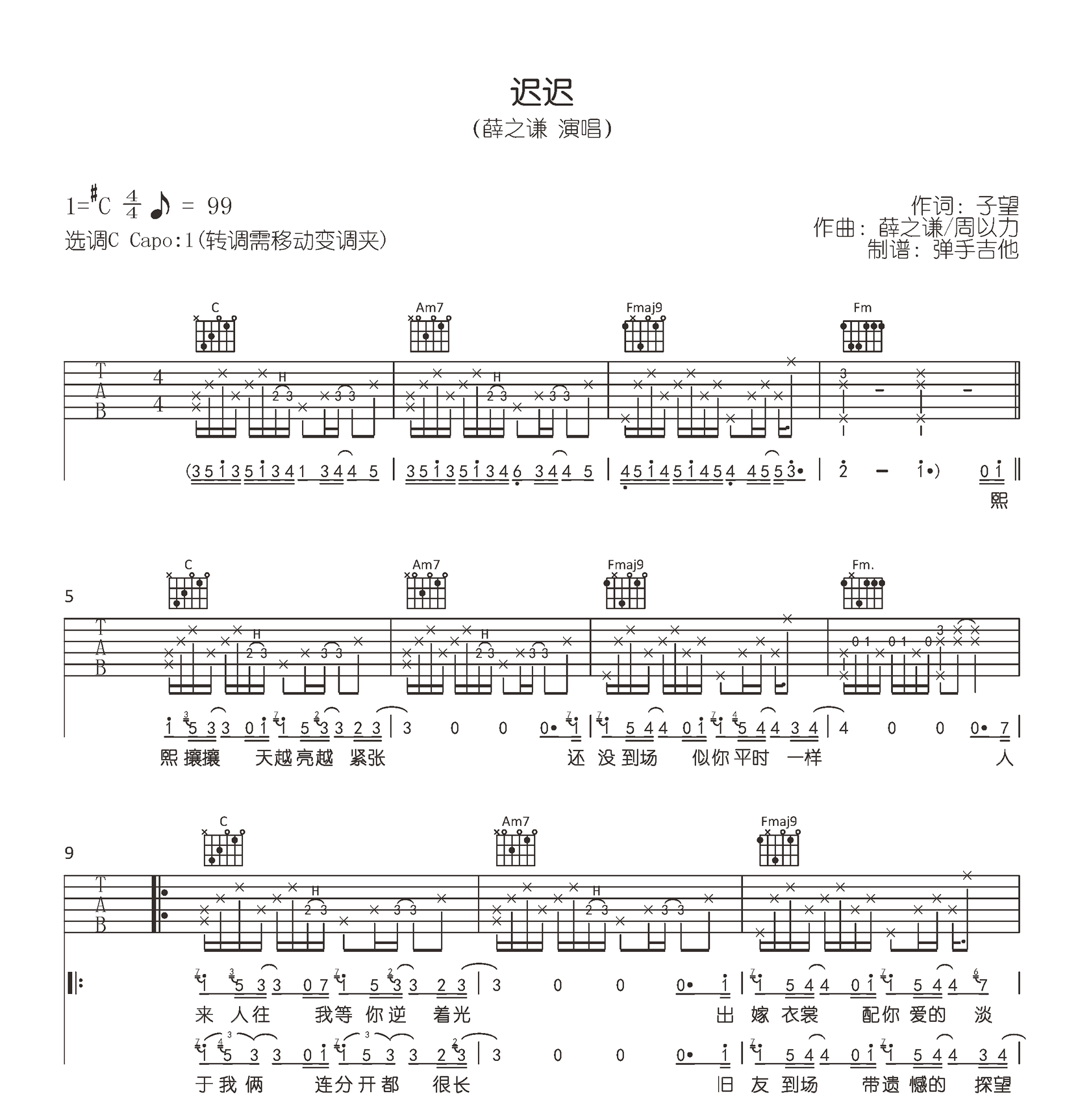 曲谱介绍: 《迟迟》吉他谱,薛之谦一首戳人泪点的薛氏情歌,迟迟吉他六线谱,C调指法,变调夹夹一品。完整版共三张弹唱图片谱。琴谱网上传推荐。