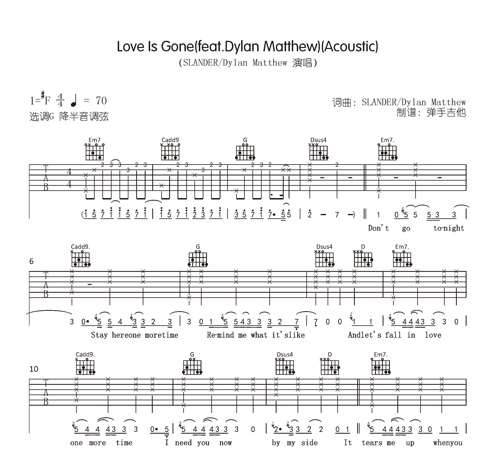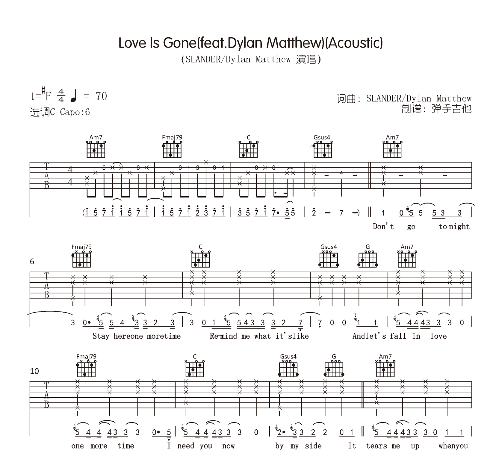 曲谱介绍: love is gone 吉他谱,SLANDER / Dylan Matthew演唱,一首热门英文歌曲,《Love Is Gone》吉他弹唱谱,原调升F,为方便琴友们选择,为大家提供了两个调式的编配版本,分别是C调和G调,完整版共六张高清图片六线谱。琴谱网整理上传。