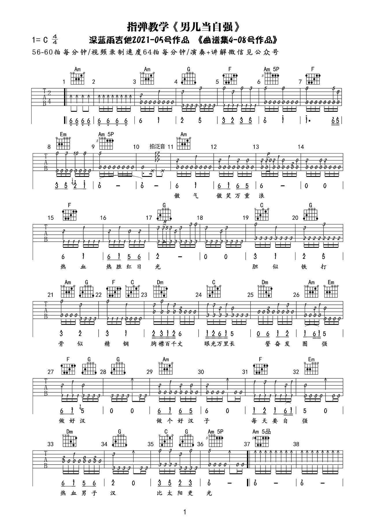 曲谱介绍: 男儿当自强指弹吉他谱,林子祥的一首经典粤语歌曲改编,男儿当自强吉他独奏谱,C调编配,随谱附上指弹吉他教学视频,本练习曲目,目的是为了加强琴友们右手连续拨低音琴弦的能力。琴谱网感谢深蓝雨吉他出品。