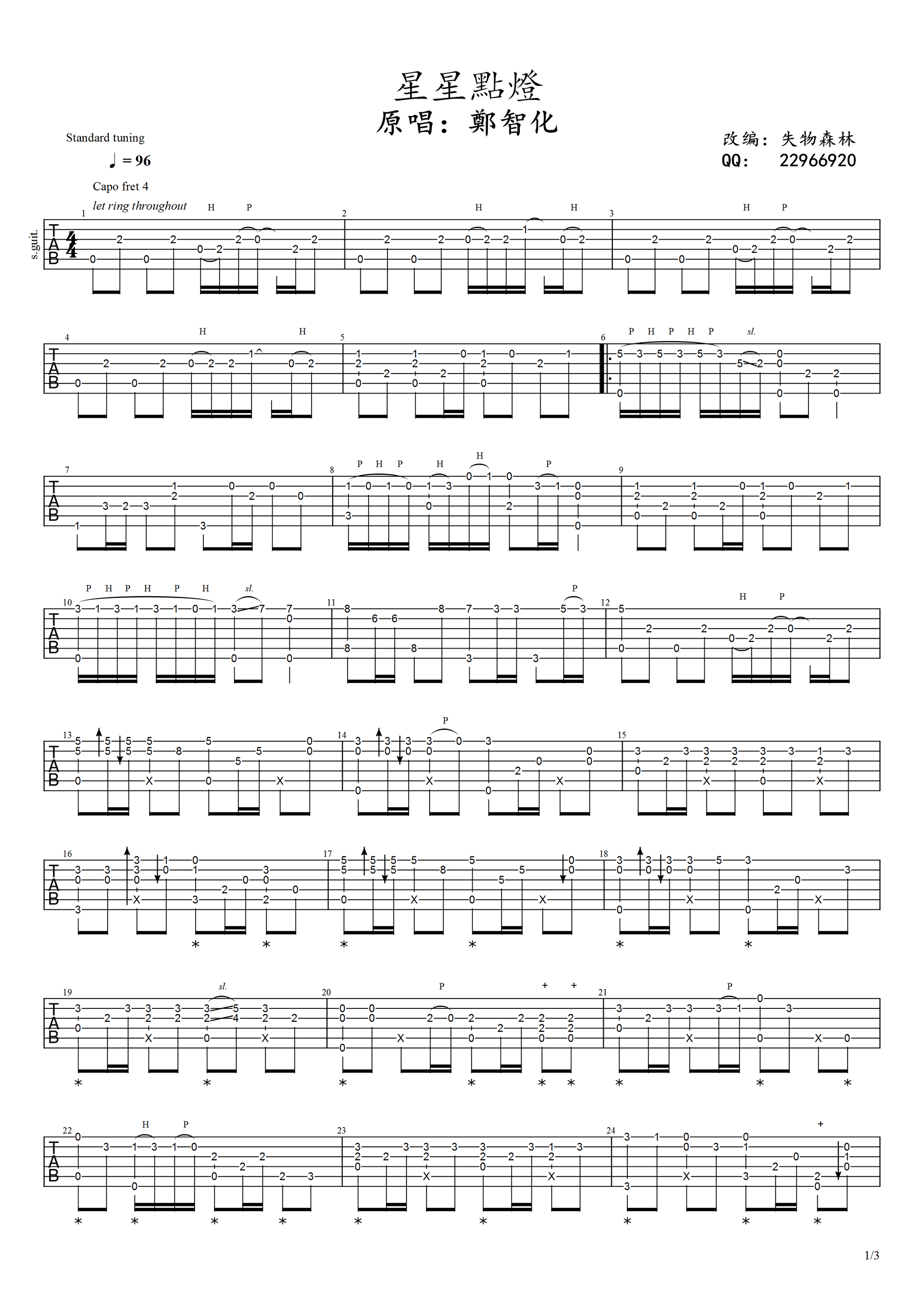曲谱介绍: 星星点灯指弹吉他谱,郑智化的一首经典代表歌曲,星星点灯吉他独奏谱,变调夹夹四品,完整版共三张高清图片谱例。感谢失物森林老师改编制谱,并带来曲谱配套吉他演奏视频,琴谱网整理上传。