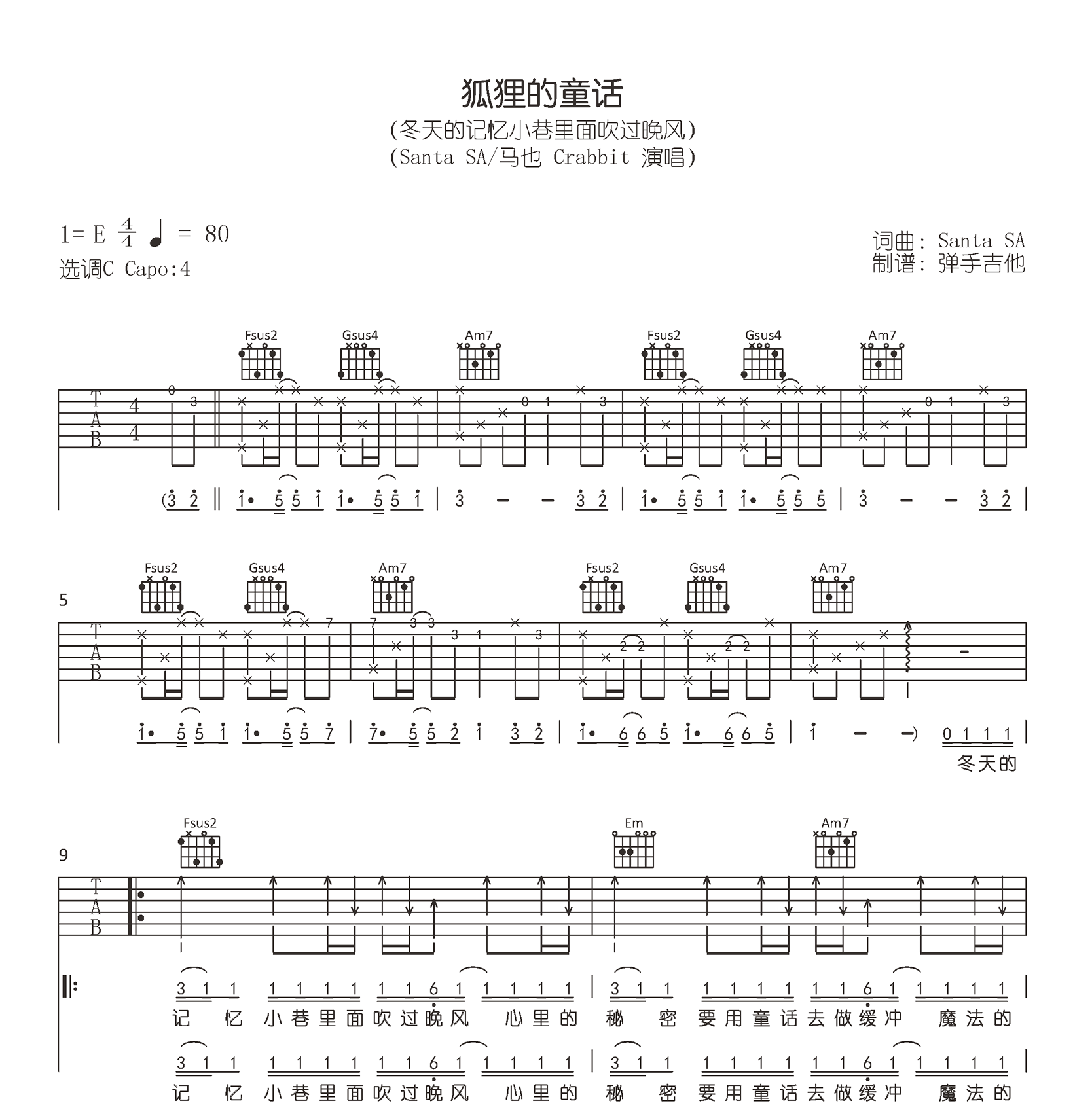 曲谱介绍: 狐狸的童话吉他谱,Santa SA/马也 Crabbit演唱的一首网络热门歌曲,狐狸的童话六线谱,原调E选调C,变调夹夹第四品,完整版共三张高清图片谱例。琴谱网更新上传,感谢琴友们对制谱老师辛苦工作的支持。