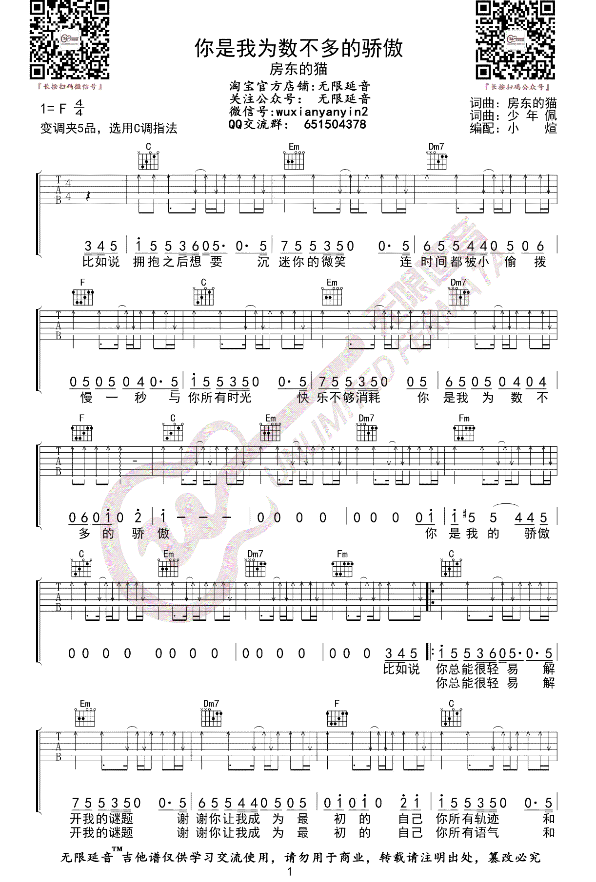 曲谱介绍: 你是我为数不多的骄傲吉他谱,房东的猫演唱的一首新歌,你是我为数不多的骄傲吉他六线谱,原调F,选调C,变调夹夹第五品。三张图片弹唱谱例,琴谱网感谢无限延音制谱分享。 听房东的猫的歌,有一种祥和安静的感觉,那是一种让人能静心的治愈良药,那娟娟如溪流的曲调,那慵懒和漫不经心的清澈声音,唱出我们每个人的真实内心渴望。