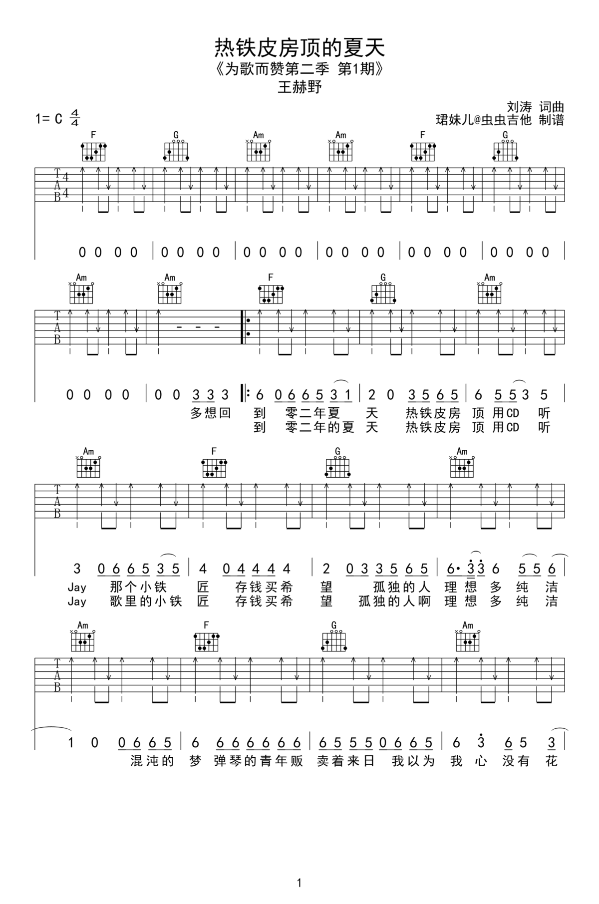 曲谱介绍: 王赫野《热铁皮房顶的夏天》吉他弹唱谱,采用C调指法编配,共有4张高清图谱。