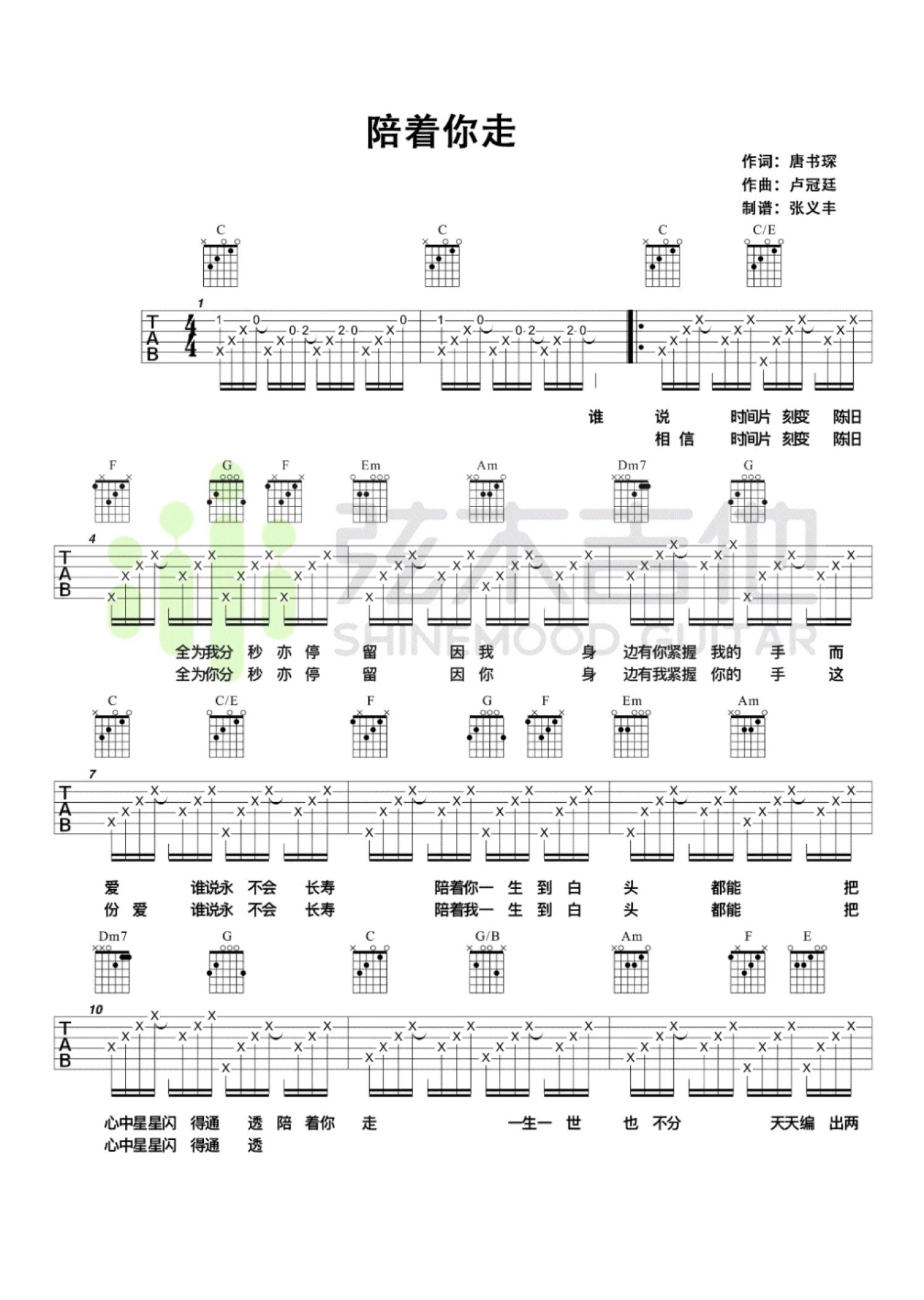 曲谱介绍: 陪着你走吉他谱,卢冠廷的经典粤语歌曲,陪着你走六线谱,C调指法,高清弹唱谱,男生变调夹夹五品,女生夹二品。女生版由谭嘉仪演唱,是TVB热播剧《不懂撒娇的女人》暖心插曲。陪着你走一生一世也不分,天天编出两双足印,过千山过千海,在我看来,这大概是最能令人觉得真挚的一句歌词了,毕竟,有什么比陪伴来得更真实动人?