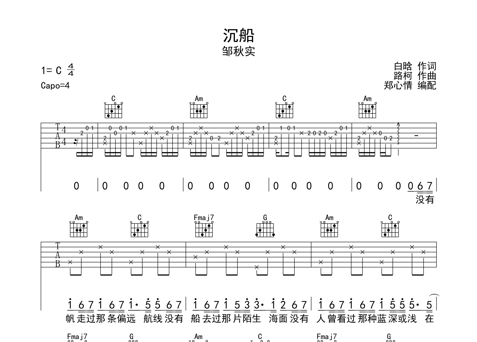 沉船吉他谱 - 邹秋实 - C调吉他弹唱谱 - 原版