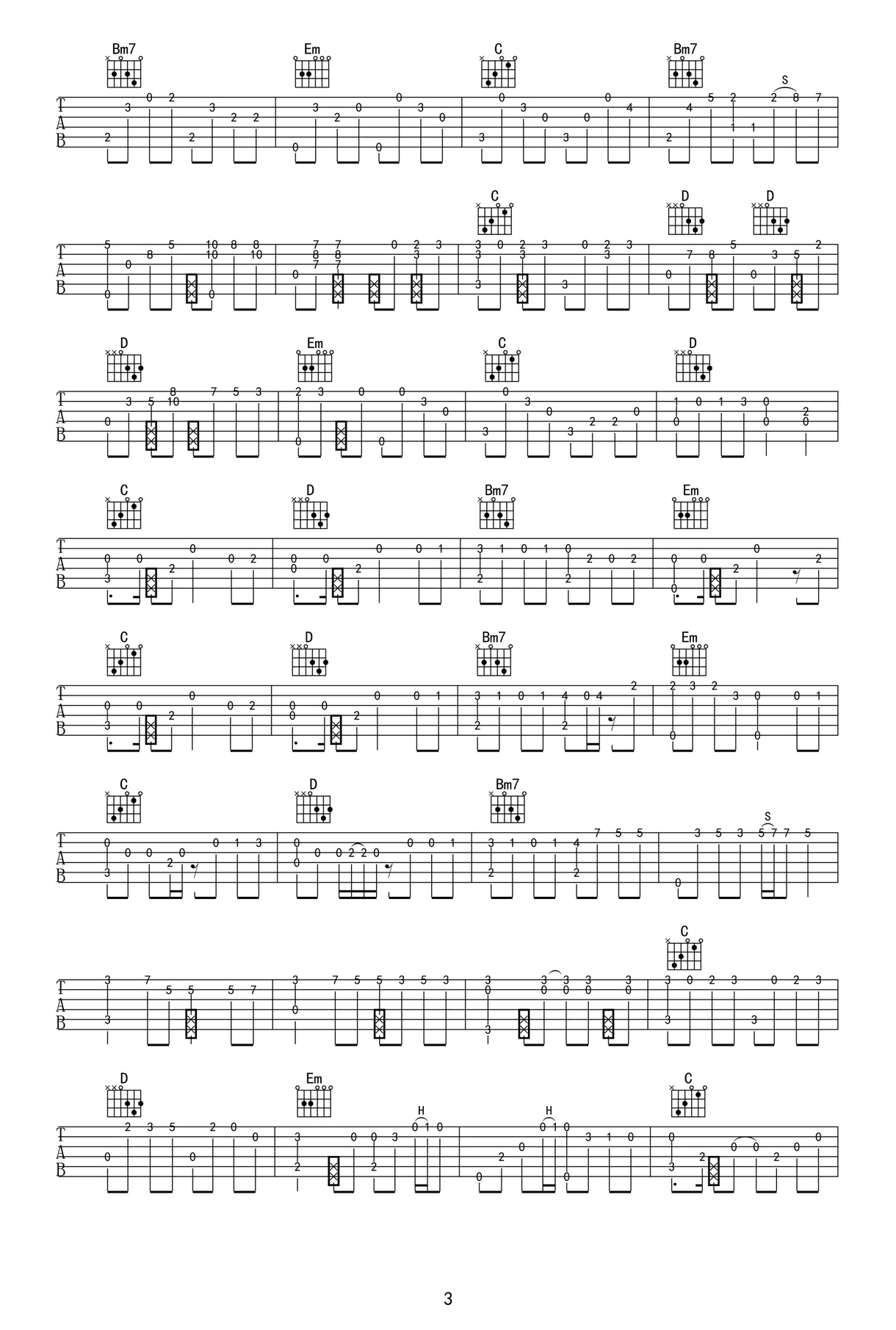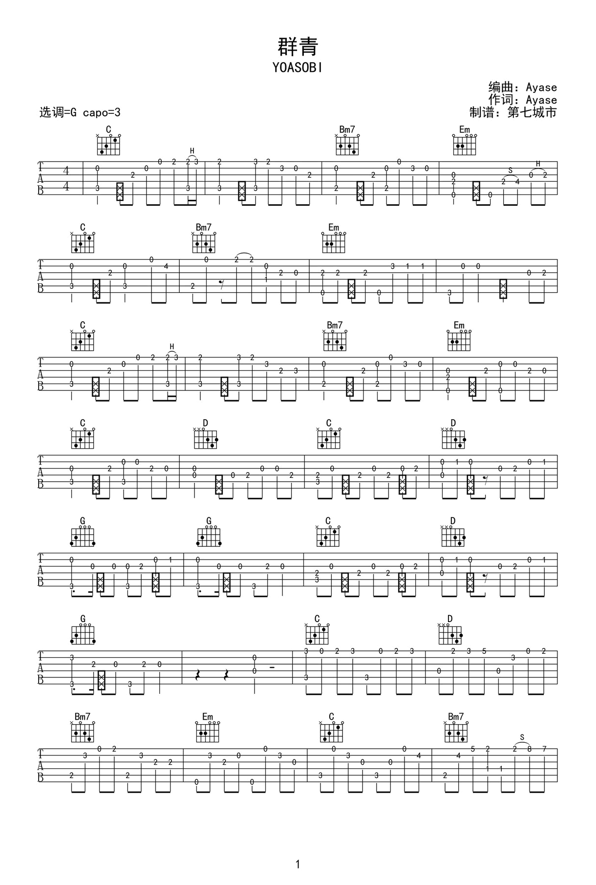 曲谱介绍: YOASOBI《群青》吉他独奏谱,采用G调指法编配,共有4张高清图谱。