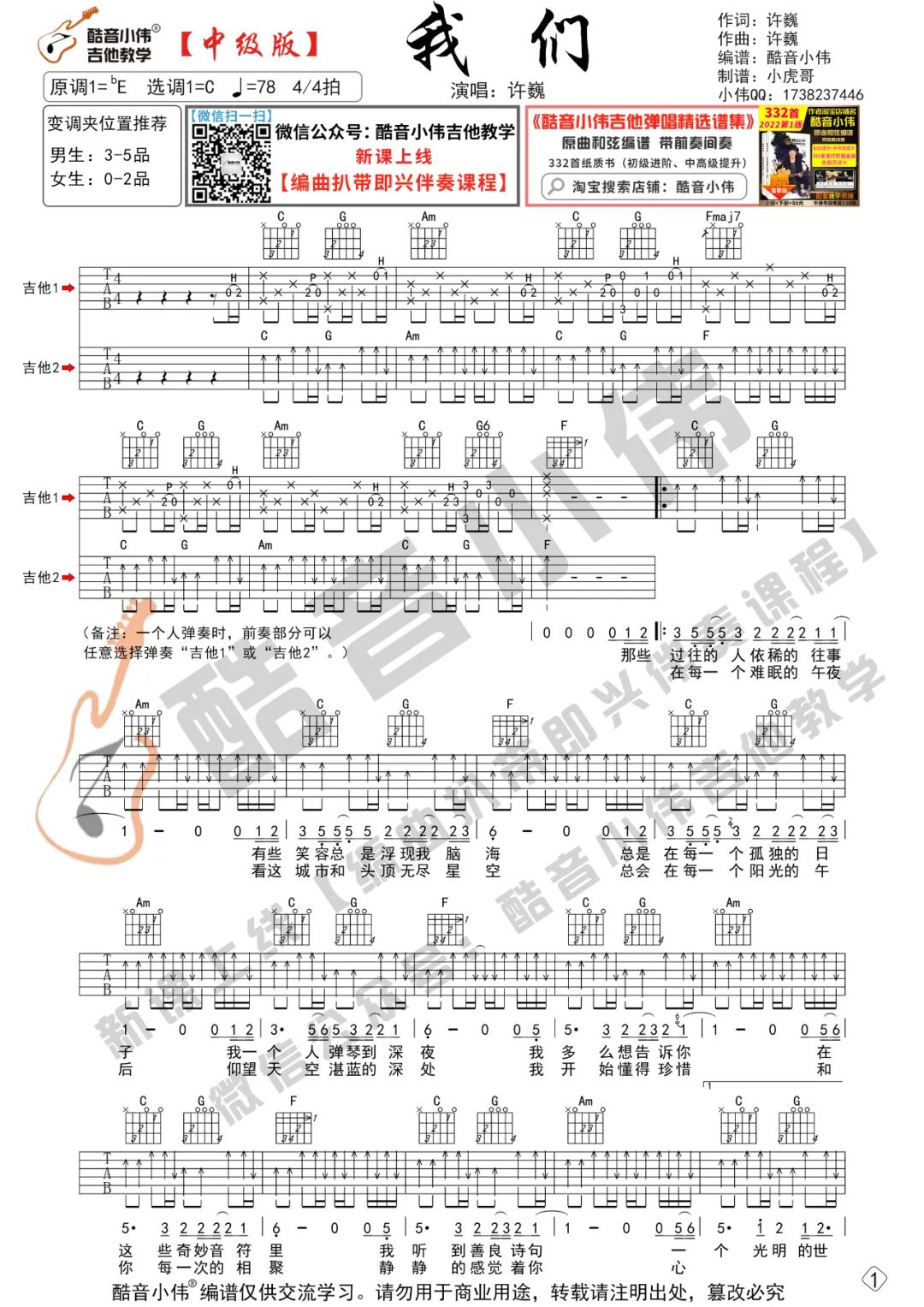 曲谱介绍: 许巍《我们》吉他弹唱谱,采用C调指法编配原版,共有2张高清图谱,免翻页排版设计。