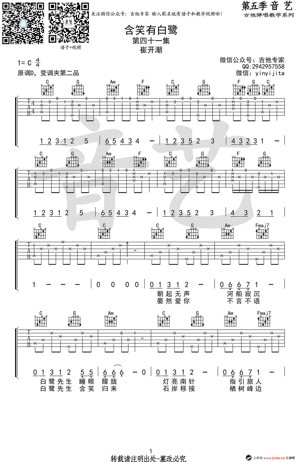 曲谱介绍: 崔开潮《含笑有白鹭》吉他弹唱谱,采用C调指法编配,共有2张高清图谱,免翻页排版设计。