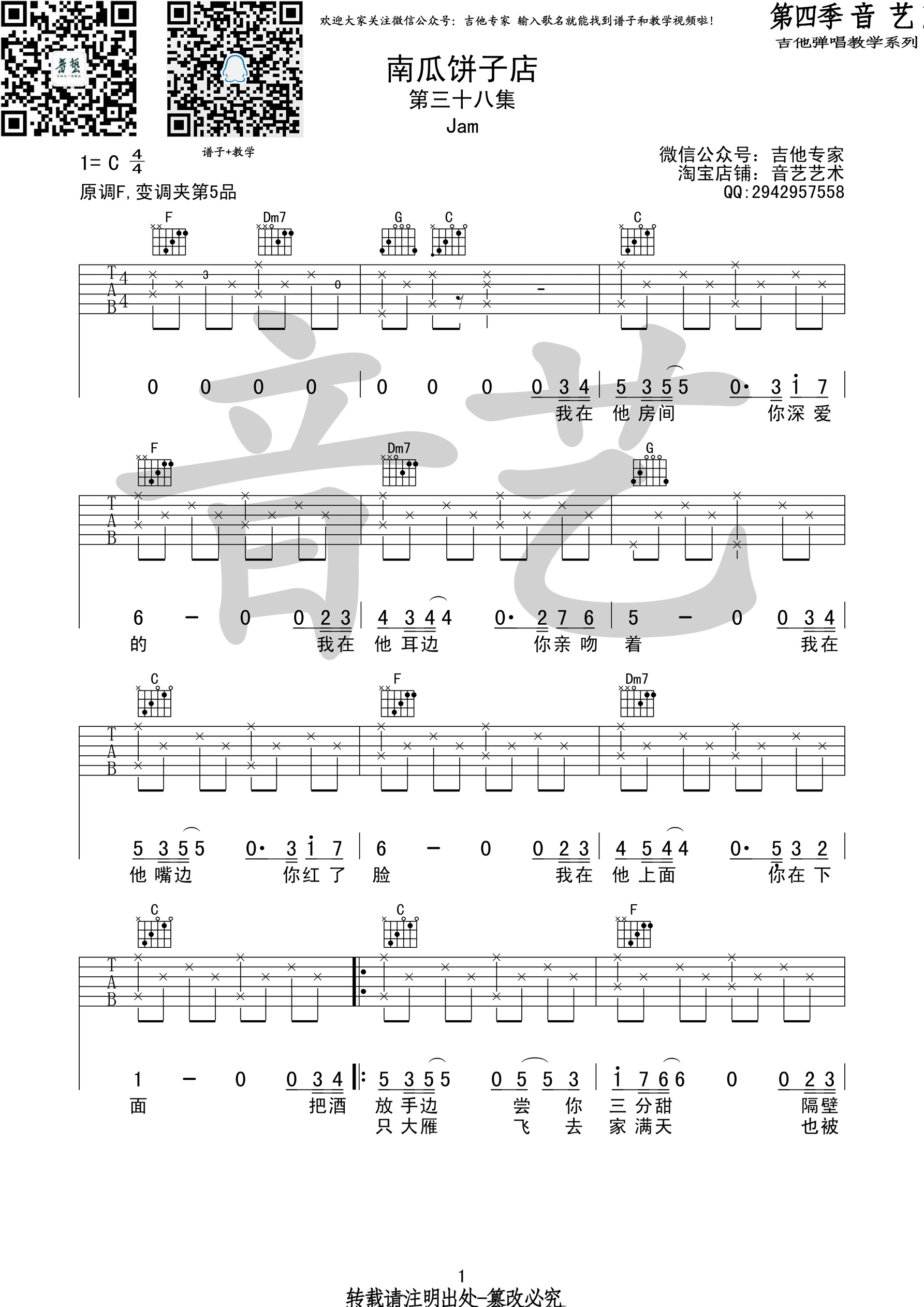 曲谱介绍: 南瓜饼子店吉他谱采用了C调指法,由音艺编配完成。这是一首由Jam填词谱曲的歌曲,也由Jam本人演唱。她的嗓音很独特,很有辨识度,让人很是喜欢,属于开口跪的歌手,这首歌曲在她的演绎之下,印上了她自己的标记,旋律很动人,受到了很多人的支持与喜爱,在这首歌曲里面,我们能够感受到一种轻松惬意的味道,歌词写的很是很是有趣,让听众的身心能够得到一种放松。重要提示:新年歌吉他谱更新啦,学完这首后,顺便把下首学了吧。