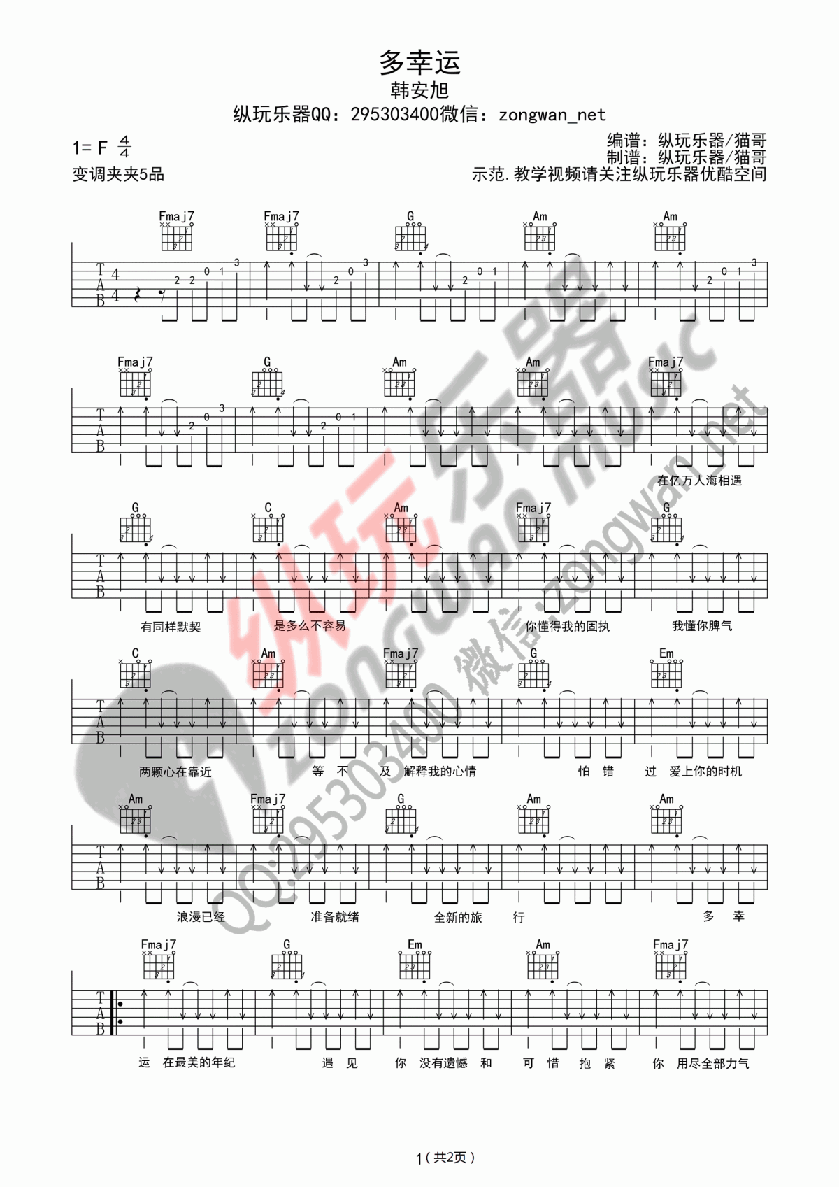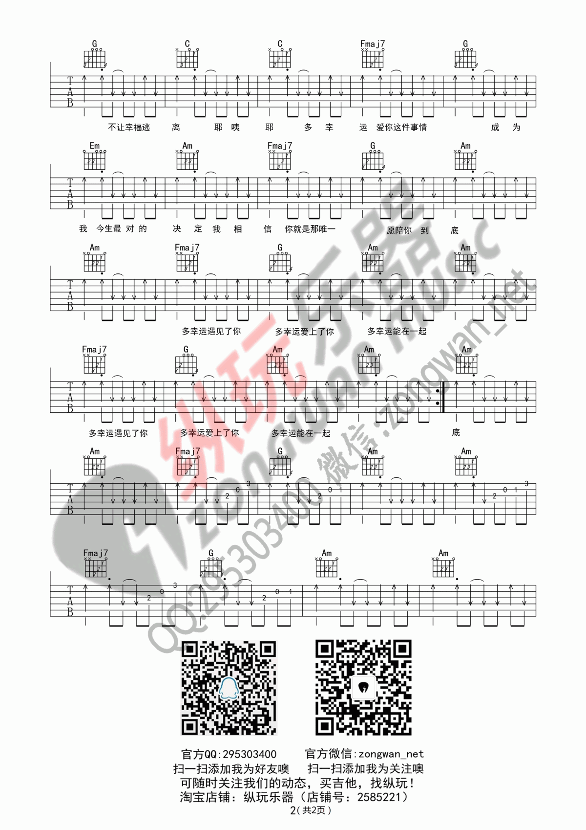 曲谱介绍: 《多幸运》吉他弹唱谱,采用C调指法编配,共有2张高清图谱,免翻页排版设计。