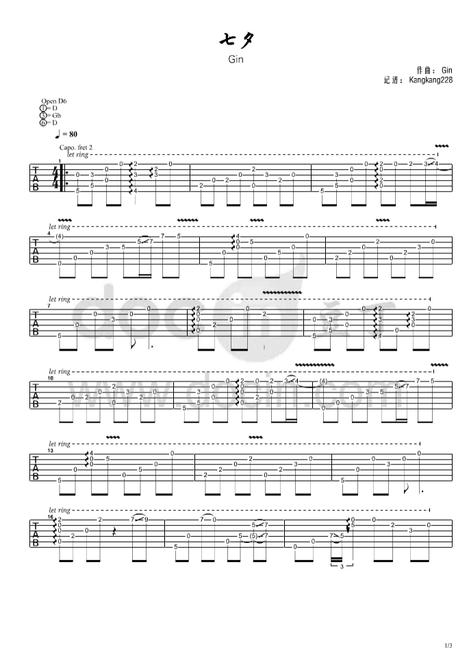 七夕吉他谱 - Gin - D调吉他独奏谱