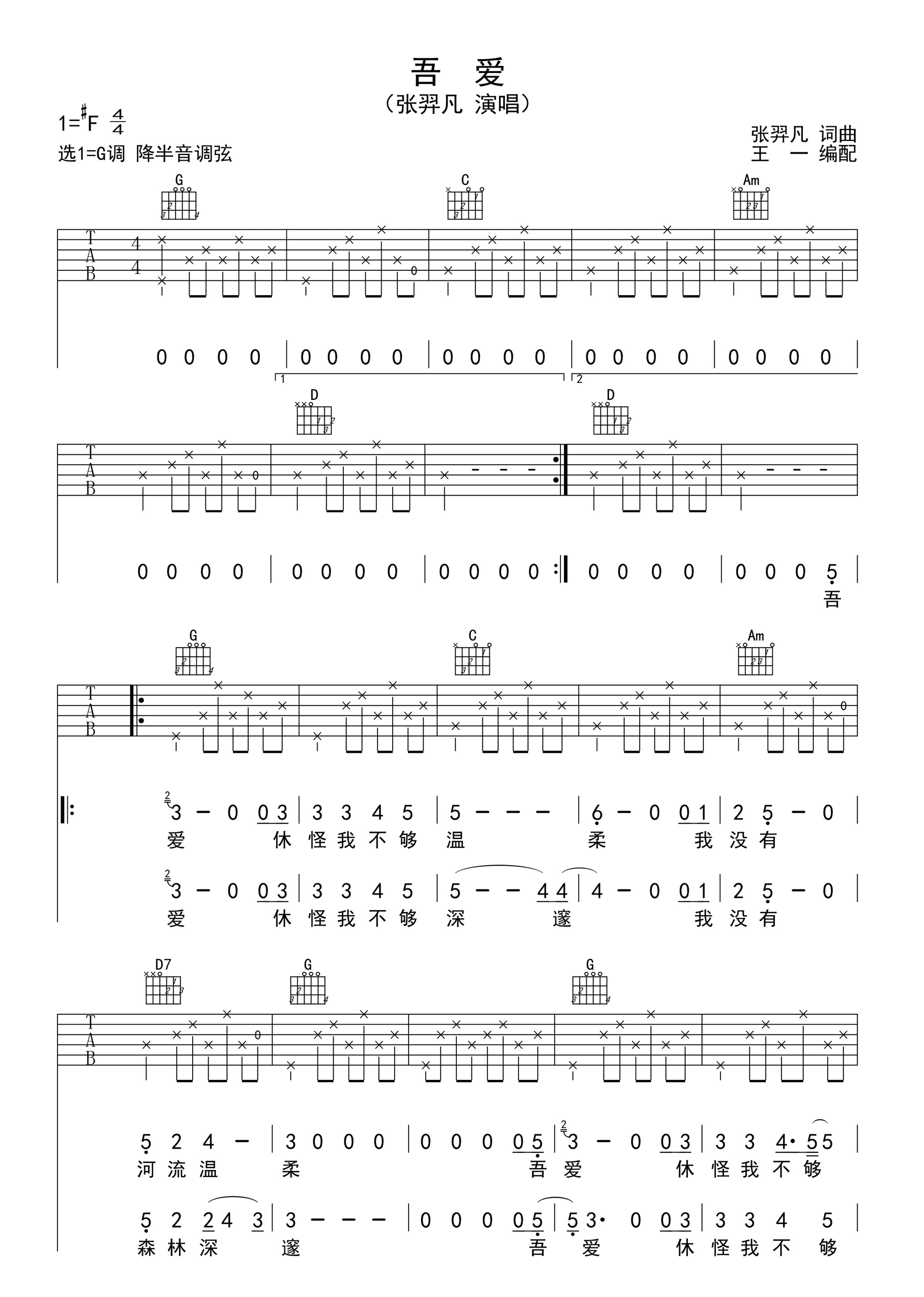 吾爱吉他谱 - 张羿凡 - F调吉他弹唱谱