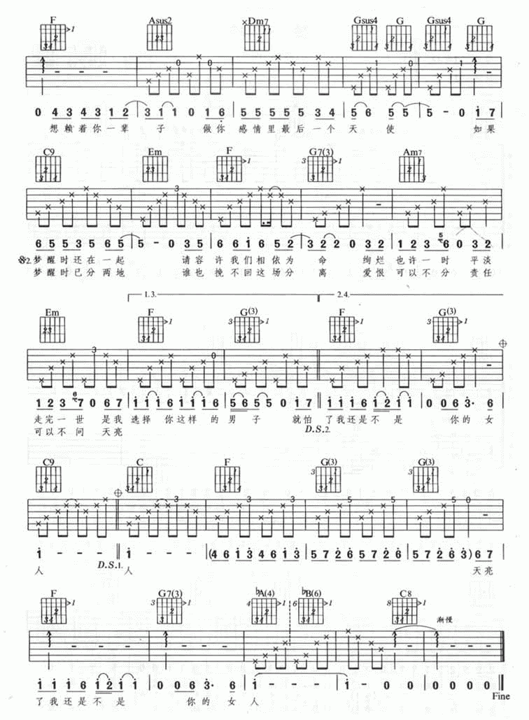 曲谱介绍: 那英《梦醒了》吉他弹唱谱,采用C调指法编配,共有2张高清图谱,免翻页排版设计。