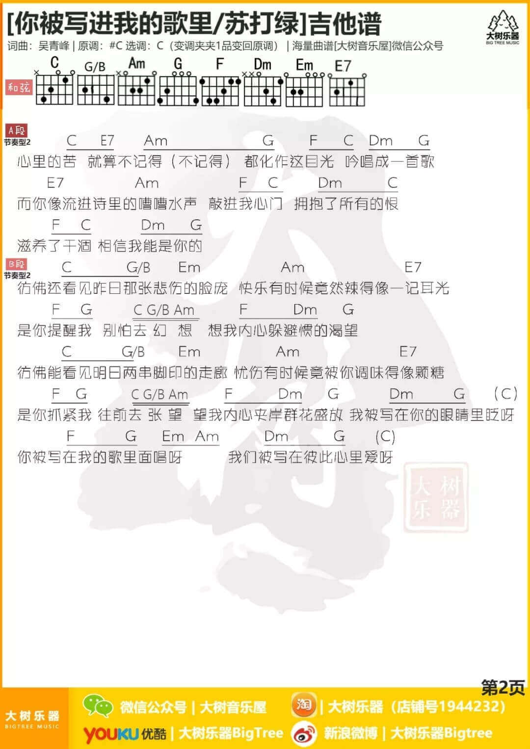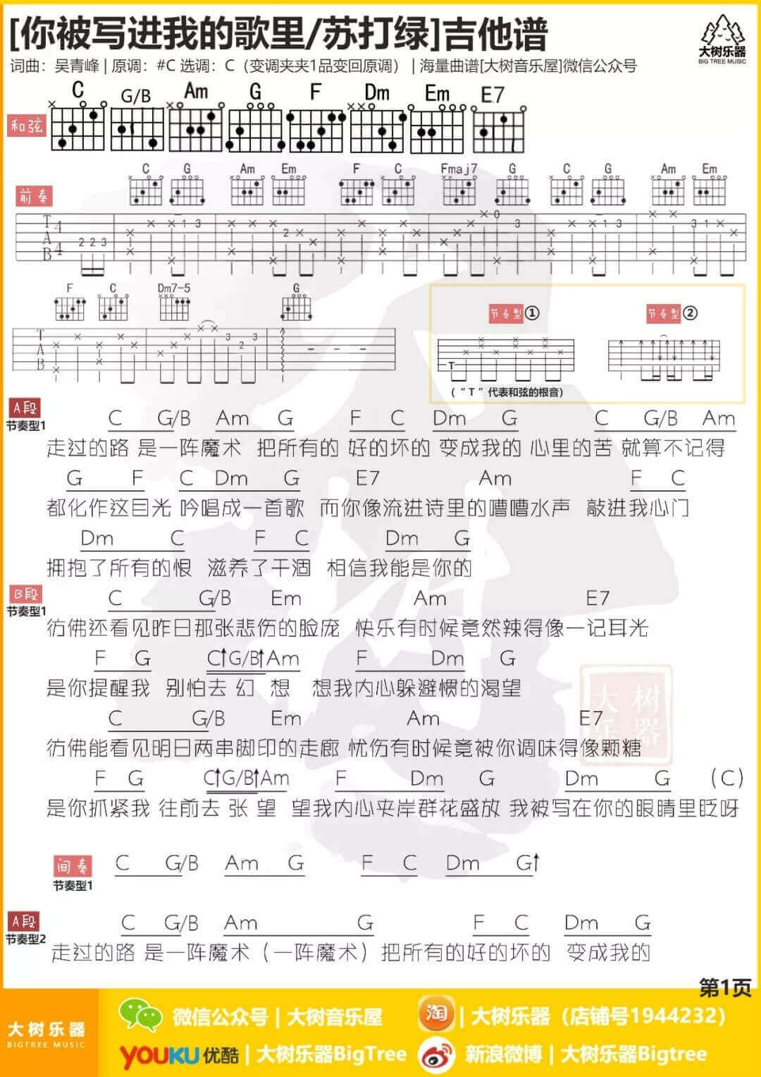曲谱介绍: 你被写进我的歌里吉他谱采用了C调指法,由大树音乐屋编配完成。这首不离不弃吉他谱也很帅,快点去学习吧,没学会的小伙伴要继续加油喔,稳!