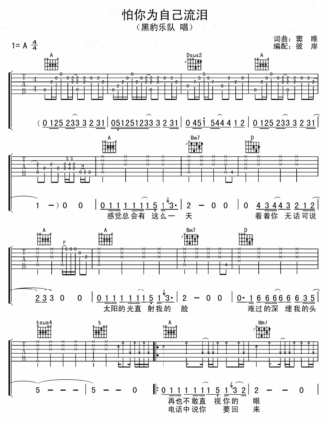 怕你为自己流泪吉他谱 - 黑豹乐队 - A调吉他弹唱谱