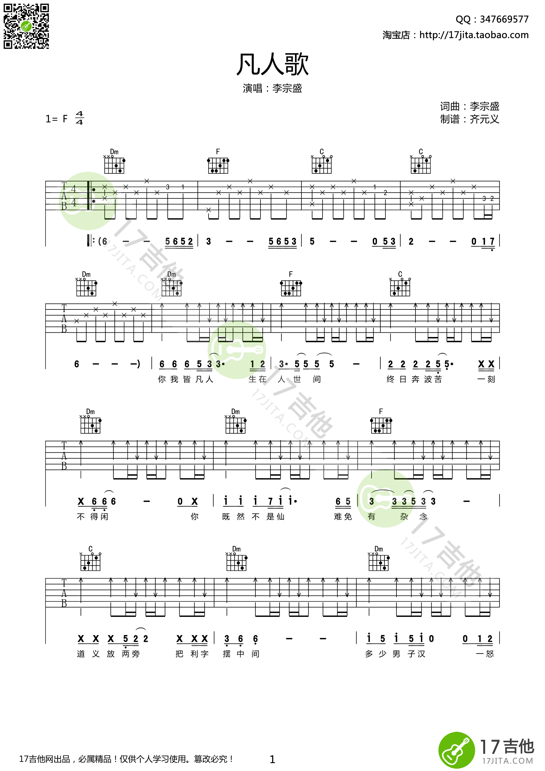 凡人歌吉他谱 - 李宗盛 - F调吉他弹唱谱 - 原版