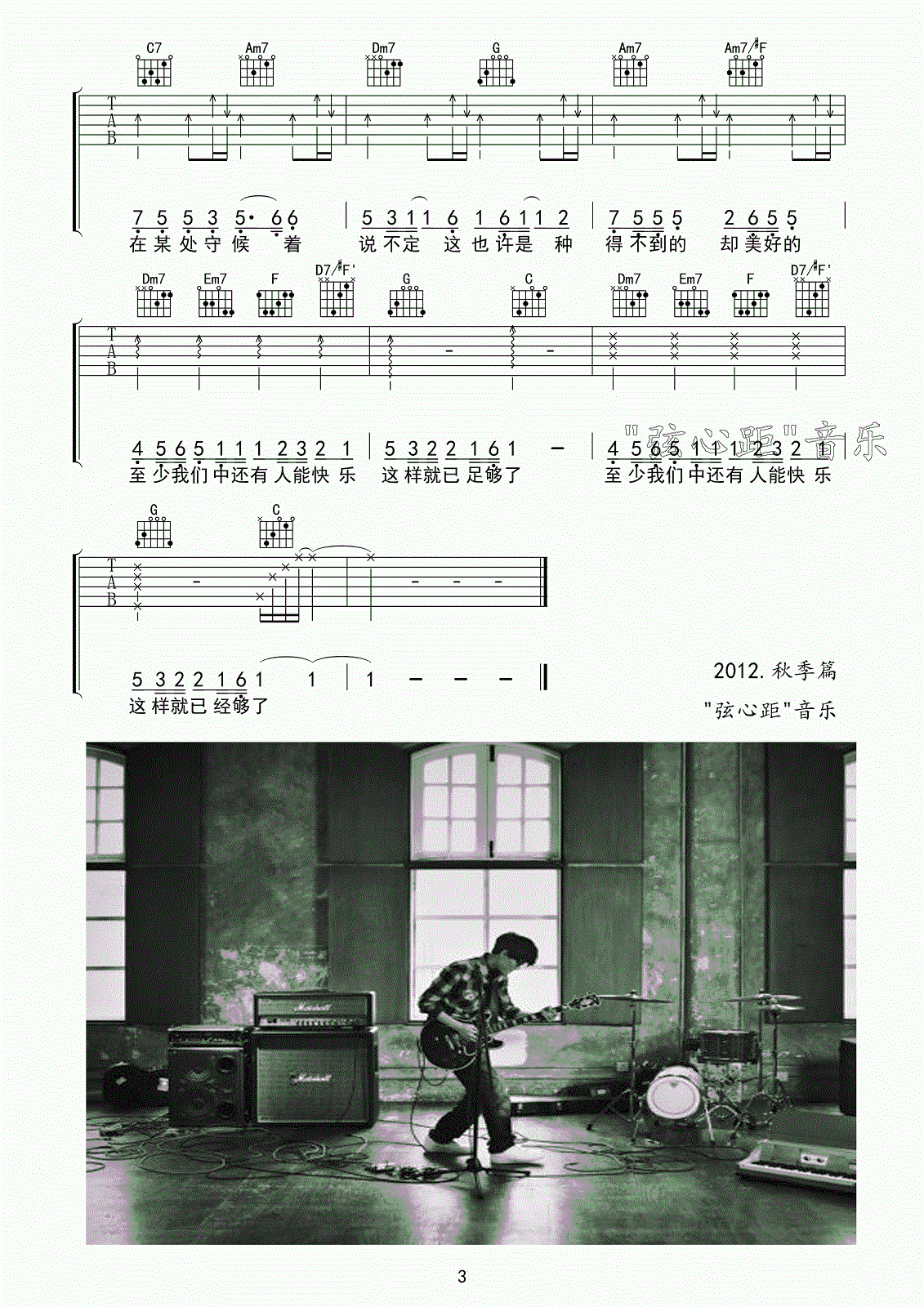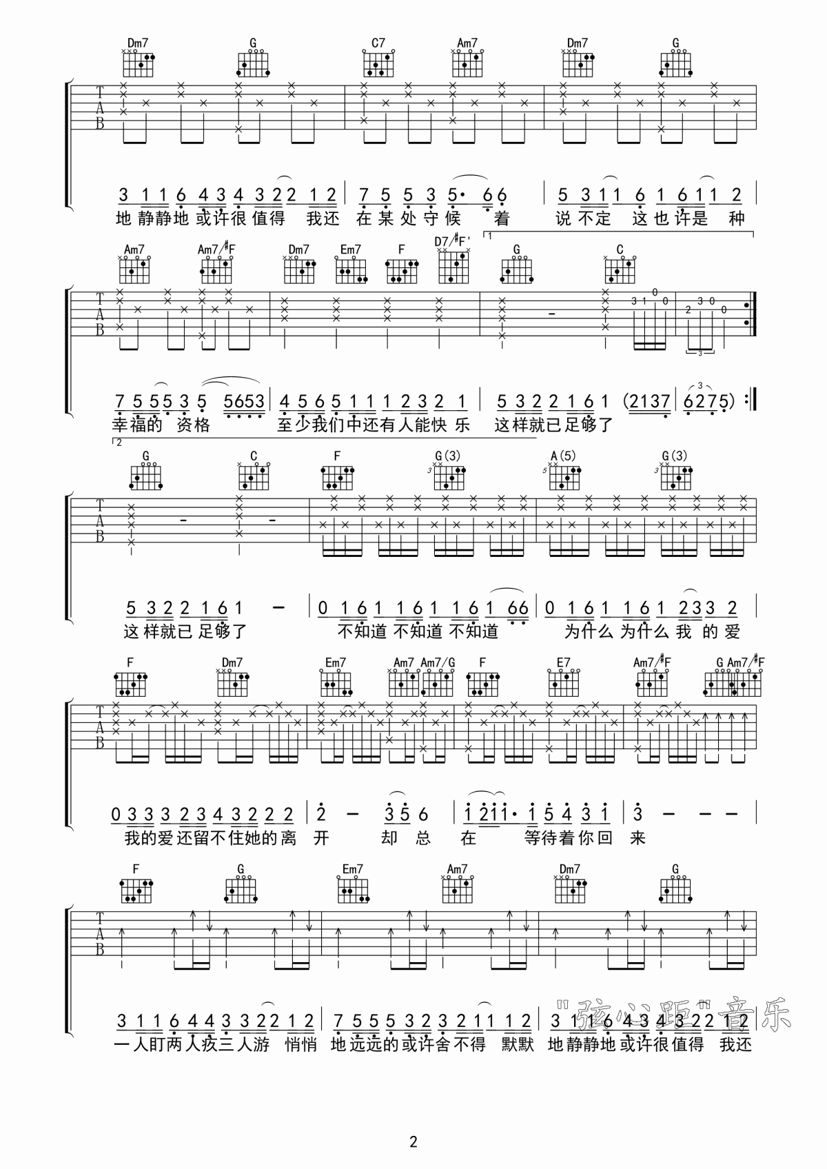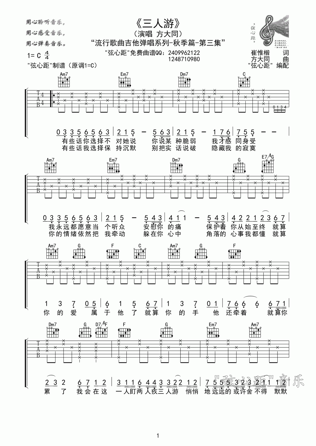 曲谱介绍: 方大同《三人游》吉他弹唱谱,采用C调指法编配,共有3张高清图谱。